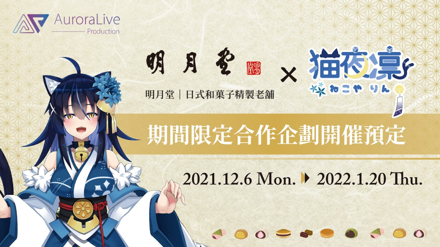 雖然在 2021 年後半年才出道,但猫夜凜出道後不久馬上就參與了「Crossing Frontier 第一屆實況主大亂鬥」賽事活動,也和菓子精製工藝老舖明月堂展開期間限定合作,可以感受 AuroraLive 擅長於 VTuber 整合行銷,是未來值得關注的企業勢。