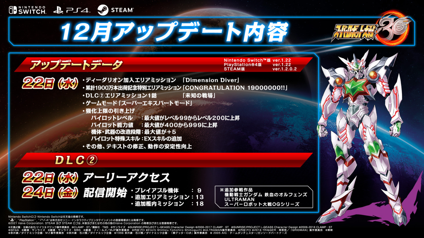 日本 Bandai Namco Entertainment 萬代南夢宮娛樂已發售 PS4/Nintendo Switch/PC Steam《超級機器人大戰30》(スーパーロボット大戦30),繼之前 11 月 19 日推出 DLC① 讓玩家們下載使用後,如今官方正式公布,DLC② 也將於 日本時間 12 月 24 日 08:00(台灣時間 07:00)推出下載!