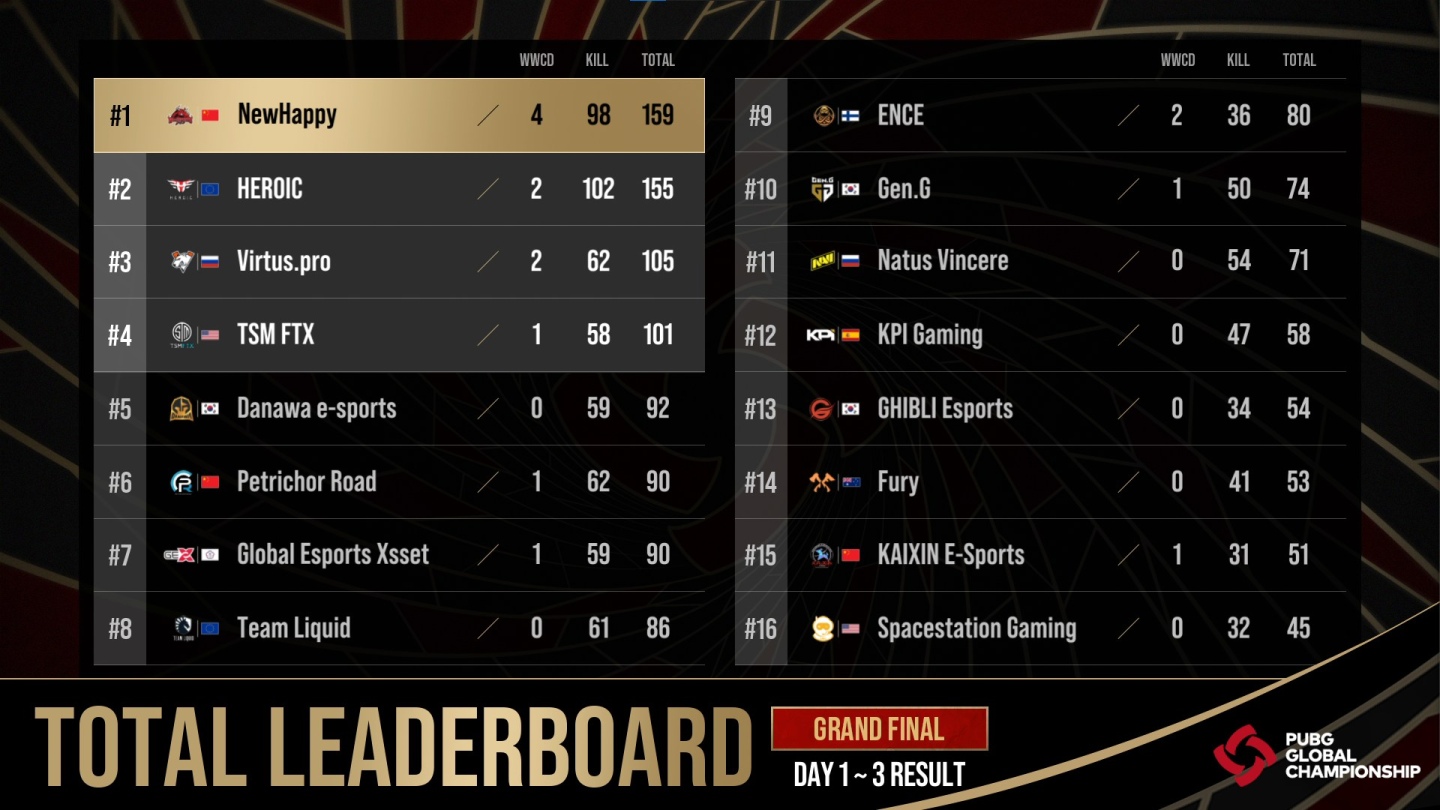 PGC 最終日,HERO、NH 再次於前兩回合大比分吃雞,分數遙遙領先所有隊伍的他們,成為本次賽事唯二有機會奪冠的隊伍。當中Match 14 為關鍵交叉點,HERO 僅獲得 3 分早早休息,NH 則是把握好機會,以回合第二名成績附帶 8次擊殺,一舉超越 HERO 佔據榜首。關鍵最後一回合,NH 與 HERO 短兵相接後提早遭到淘汰,HERO 只要穩定拿下超過 4 分的分數,就能再次成為榜首拿下世界賽冠軍,HERO 雖然堅持到比賽後半段,卻遭遇複數隊伍聯合攻擊,就在緊張時刻,GEX 成為壓倒駱駝的最後一根稻草,從後方推進並殲滅 HERO 剩餘選手,讓尚有 4 分分差的 HERO,最終飲恨拿下亞軍,冠軍拱手讓給NewHappy!