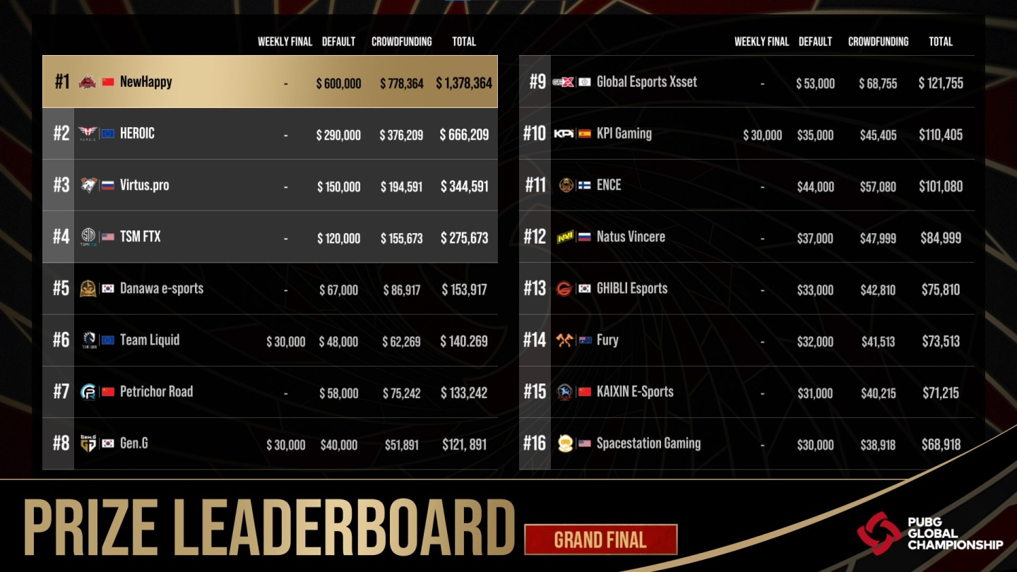 《絕地求生》(PUBG: BATTLEGROUNDS,以下簡稱 PUBG)所舉辦之 PUBG 電競年度壓軸賽事「PGC 世界冠軍賽 2021」(PUBG Global Championship 2021,簡稱 PGC 2021)於周日晚上(12/19)落幕。來自中國賽區的 NewHappy(NH)打出了奇蹟,與歐洲賽區的 HEROIC(HERO)纏鬥至最後一回合的最後一刻,才真正分出勝負,NH 以 4 分的些微差距擠下領先總決賽大部分時間的 HERO,成功奪下了 PGC 2021 世界冠軍頭銜,並斬獲高達美金$1,378,364 元(約新台幣 3,835 萬元)的高額獎金。