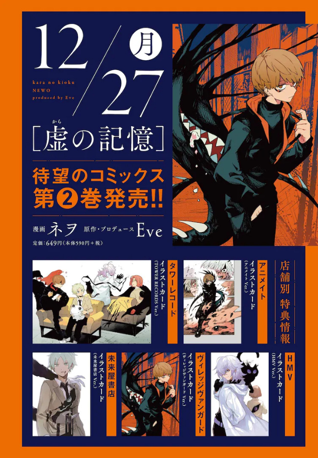 歌手 Eve 擔任原作和企劃,由ネヲ作畫的漫畫《虛之記憶(暫譯,虚(から)の記憶)》單行本第二集於今天(12/27)在日本發售。