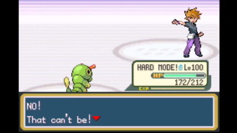 一般綠毛蟲在《寶可夢 火紅葉綠》只能學會「撞擊」和「吐絲」兩個技能,HirokiTakumi 則是讓他遺忘「吐絲」使用方式,只不斷使用一般系的「撞擊」造成傷害。在對付一般系無法造成傷害的幽靈系時,他仍會持續使用「撞擊」,直到技能的 PP 用盡,接著綠毛蟲會開始使用「掙扎」。雖然這會對自身造成一些傷害,但 HirokiTakumi 最終仍然成功挺過了一切。
