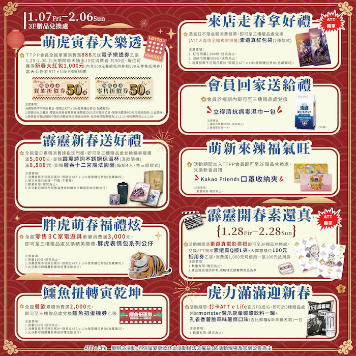 除了一系列的精采活動外,ATT e Life 自 1/7 起至 2/6 止再祭出八重新春好禮,滿額禮、來店禮、打卡禮及會員專屬好禮一次到位,就是要為消費者的新年增添好喜氣!(以下好禮數量有限,兌完即止)