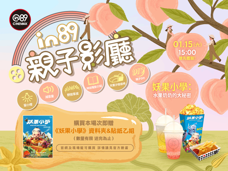 2022年1月15日全國in89系列影城搶先推出《妖果小學:水果奶奶的大秘密》親子影廳限定場,預售現已開跑。