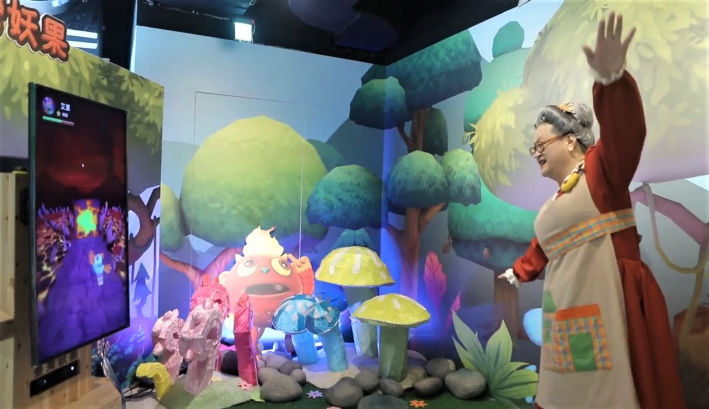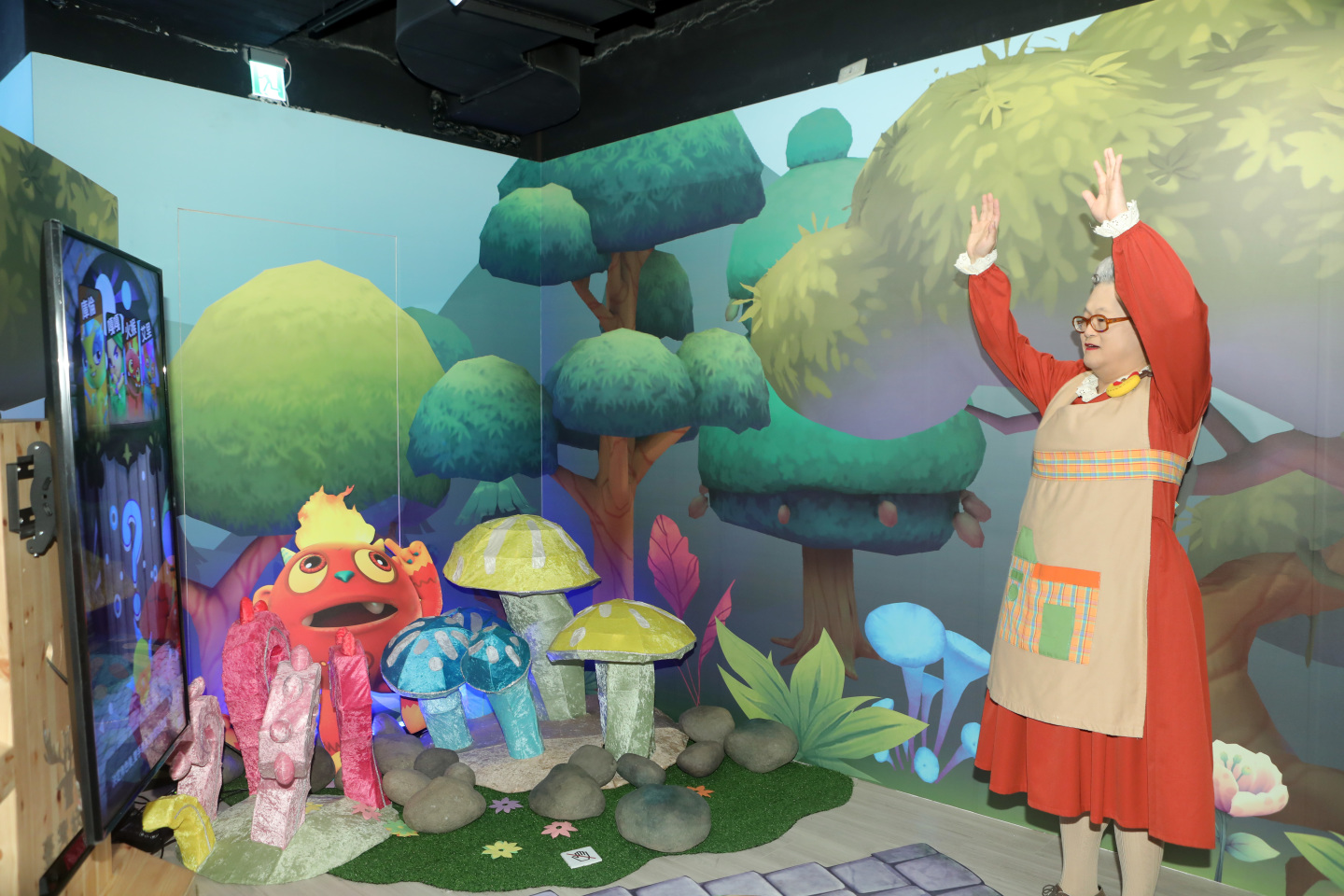 水果奶奶體驗妖果小學體感遊戲機台,笑說這也是有一點運動效果。