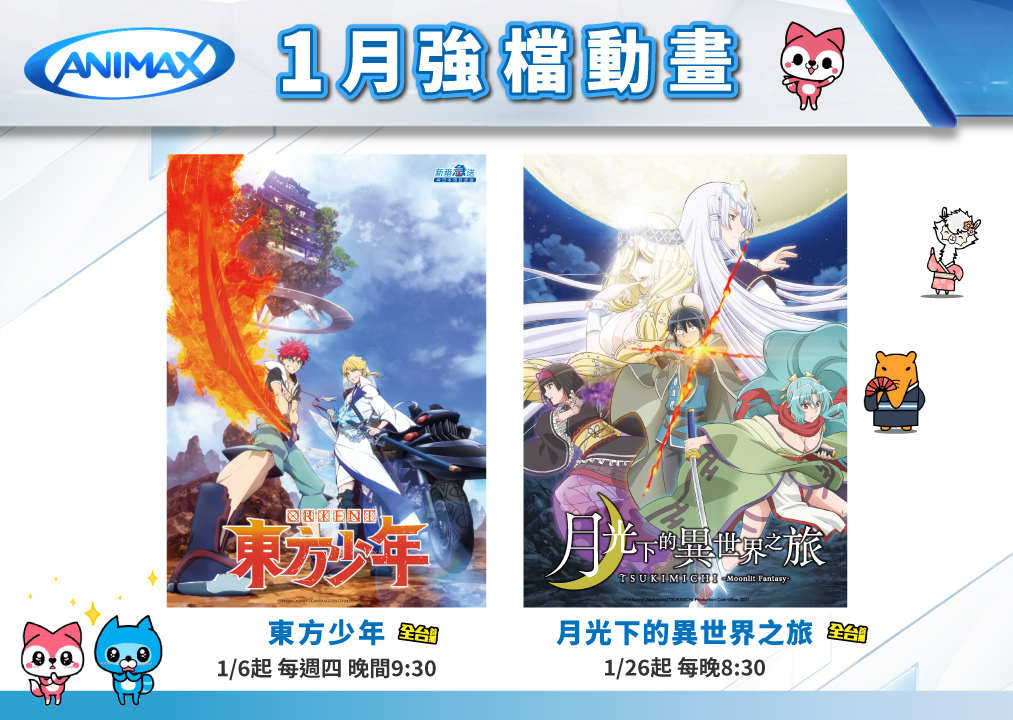 Animax 頻道在 1 月底帶來電視首播動畫《月光下的異世界之旅》陪大家過新年!《月光下的異世界之旅》是日本小說家あずみ圭在「成為小說家吧」網站上連載的異世界穿越奇幻小說改編,由動畫公司 C2C 製作,小說銷售累積至今已超過 200 萬冊,電視動畫在第一季創下日本電視台動畫史上最高海外營收紀錄;聲優陣容華麗,由人氣聲優花江夏樹、鬼頭明里、佐倉綾音擔任主角群配音,自 1/26 起每晚 8:30 將在 Animax 頻道首播,題材有趣且人物作畫細緻優秀,絕對不能錯過。