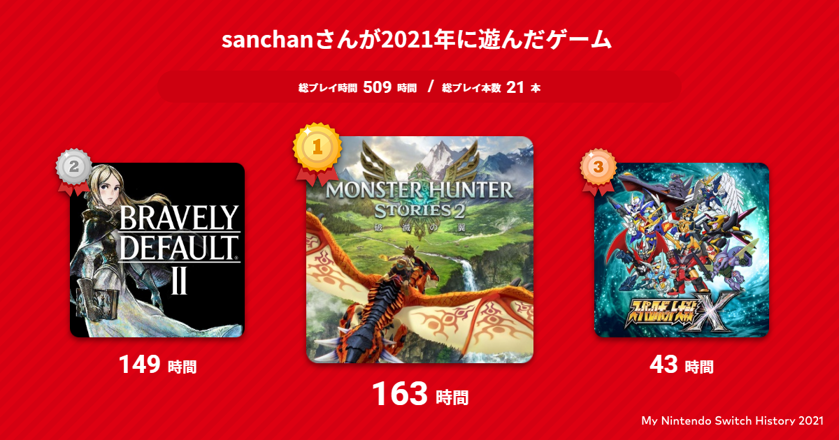 在這次的「My Nintendo Switch History 2021」,首先會為玩家們公開自己自己過去一年內所遊玩遊戲中,遊玩時間最長的前三名遊戲,以及每個月由玩遊戲的時間狀況等資訊,讓玩家回想自己在過去一年內,到底玩了哪些遊戲,以及總計到底花了多少時間遊玩。