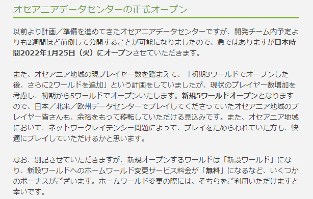 在 2021 年 12 月 3 日開放擁有早期通行權(Early Access)的時候,由於全球半導體供貨吃緊導致來不及增設伺服器來服務玩家,並且實施了巔峰限制措施;而現在供貨情況有逐漸改善,預計 1 月 25 日增設大洋洲區資料中心(DC)「Materia」,底下共有五個伺服器,並配合新 DC 的開放,於次(26)日重新啟動轉服服務,之後會依據各 DC 的登入降低情況逐漸解放讓新玩家加入。