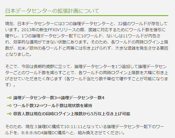 日本資料中心目前具有 32 個世界(伺服器),目前是 10:11:11,未來將會以 8:8:8:8 的方式進行,吉田直樹表示,以長久計劃來看,新增資料中心、把伺服器分散是為了能讓最高同時登錄人數提高 5 萬人以上,對資料中心與伺服器的更動時程如下: