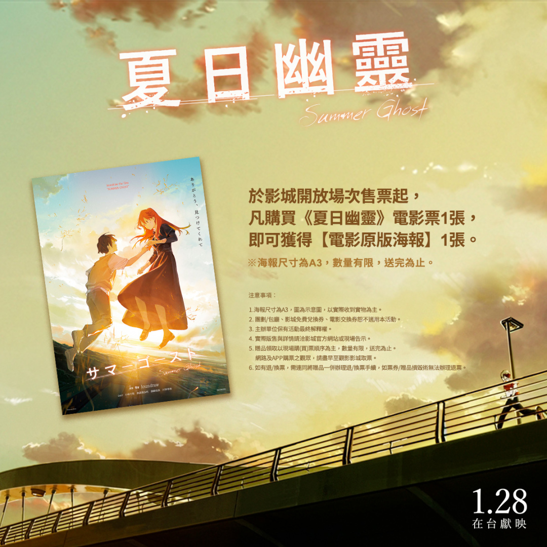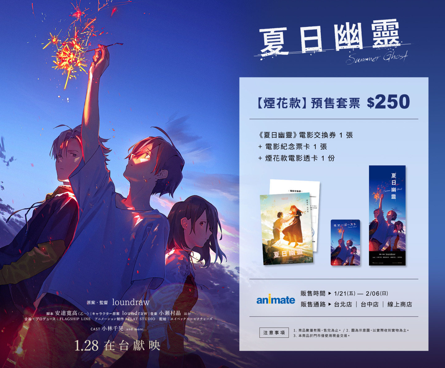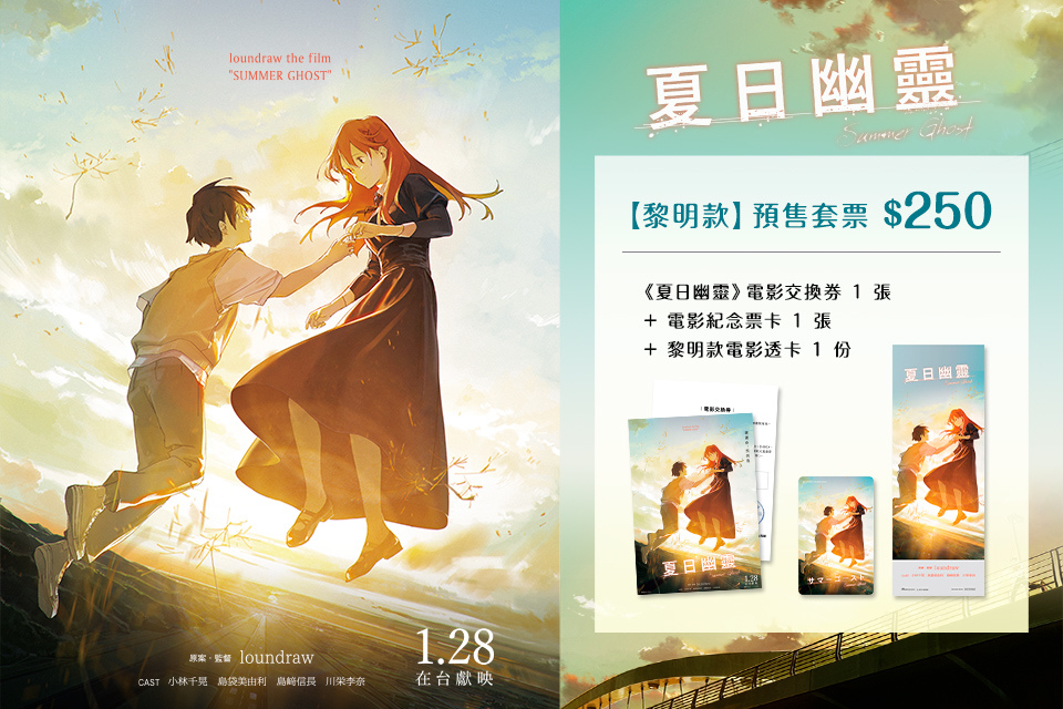為了紀念《夏日幽靈》將登上台灣大銀幕,特別推出了限量購票特典與預售套票,讓導演 loundraw 的粉絲及《夏日幽靈》的影迷都可以將精美特典帶回家珍藏!凡購買《夏日幽靈》電影票乙張,即可獲得限量「A3 電影原版海報」乙張,此外,安利美特指定門市、線上商店也獨家推出「《夏日幽靈》煙花款預售套票」,內含《夏日幽靈》電影交換券、電影紀念票卡、煙花款電影透卡各一份;車庫娛樂官網獨家販售「《夏日幽靈》黎明款預售套票」,內含《夏日幽靈》電影交換券、電影紀念票卡、黎明款電影透卡各一份,以導演 loundraw 繪製的主視覺製作的套票組合,都非常值得粉絲收藏紀念!《夏日幽靈》將於 1/28 在台上映。