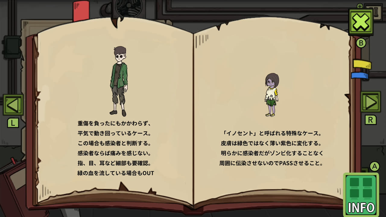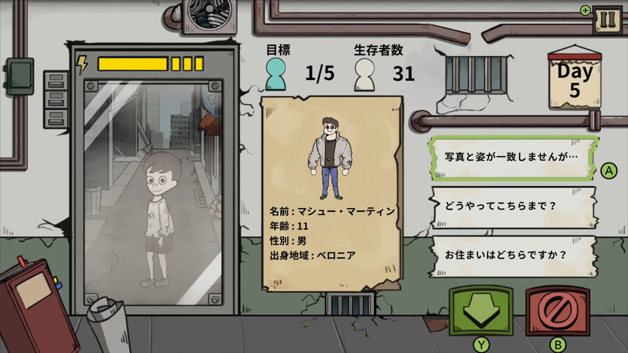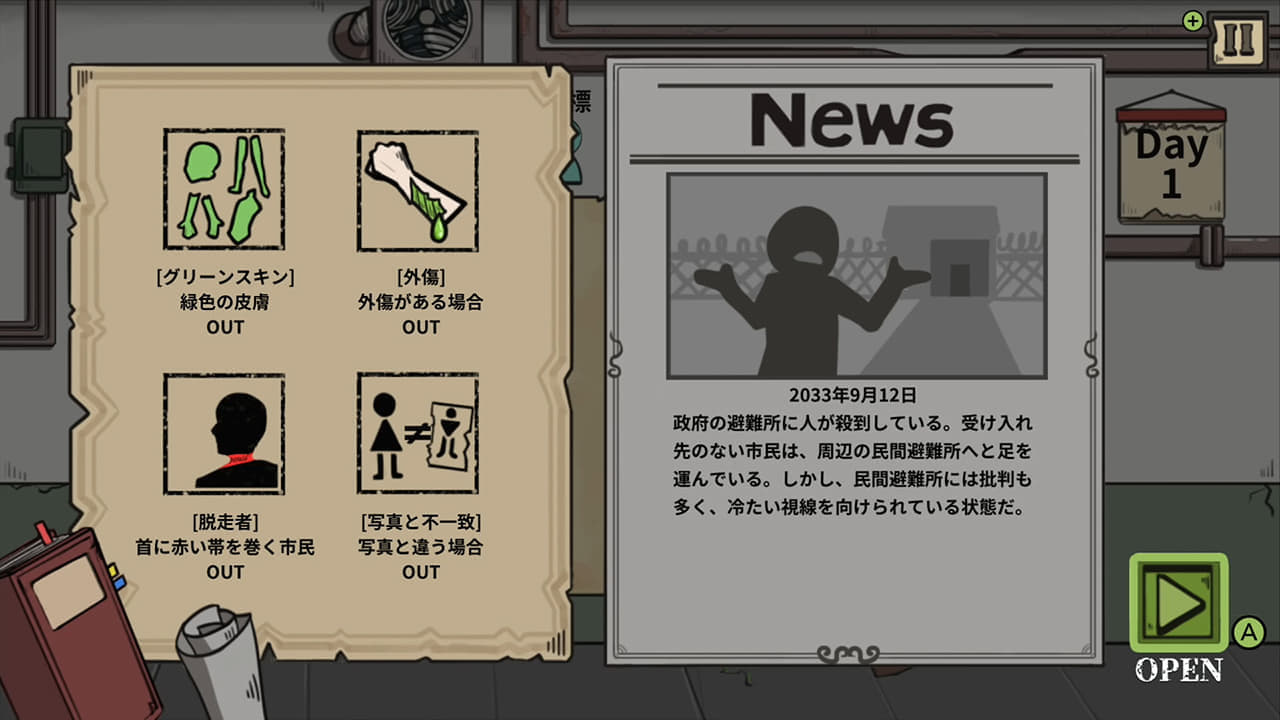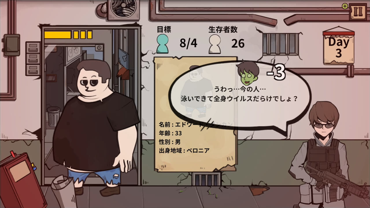 玩家在遊戲中扮演避難所的調查員,透過盤問比對資料,仔細區別出喪屍跟普通人,有時候還需要成為避難所裡的協調員,在各方勢力裡周旋,所做出的每個選擇都可能影響劇情的走向,遊戲內共有 9 個不同的結局,能否在這個喪屍蔓延的末日世界存活下來就看玩家的抉擇了。