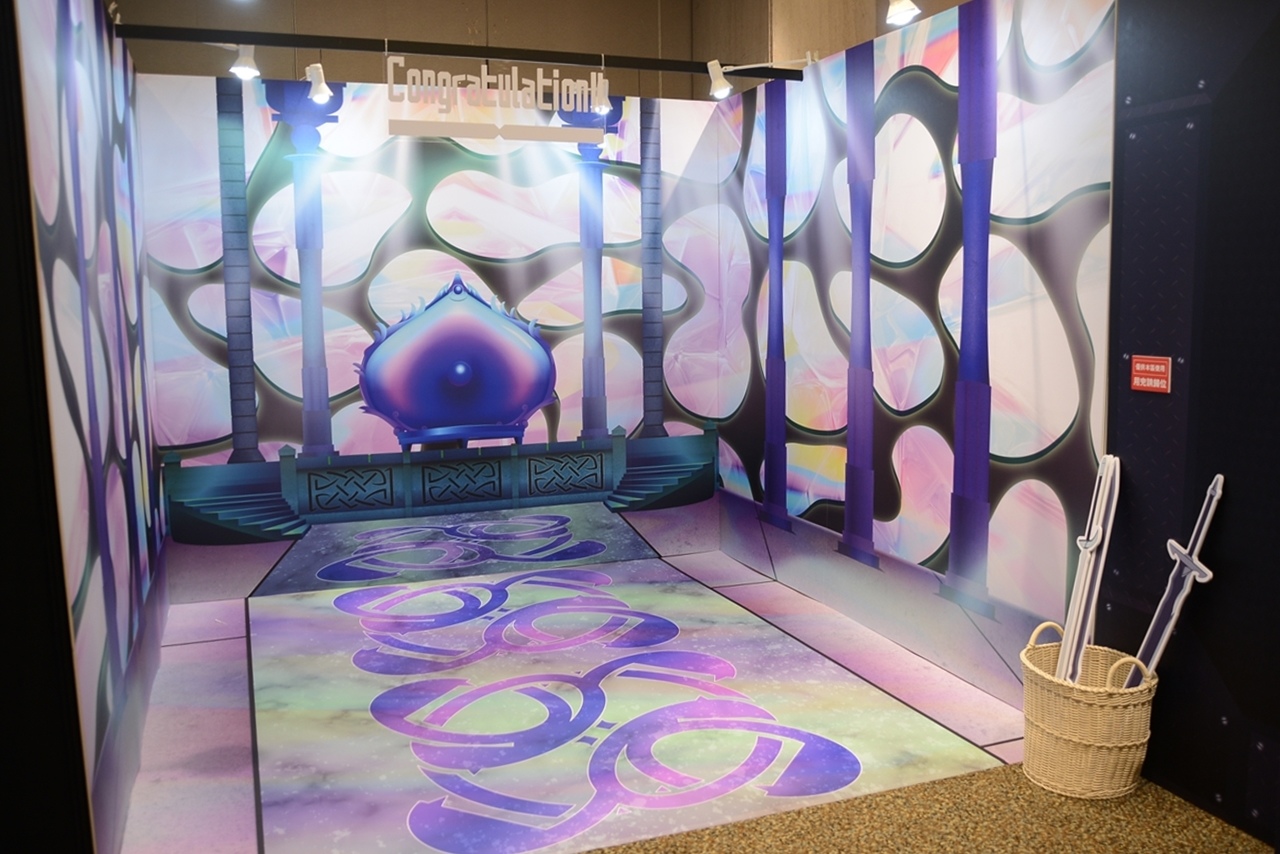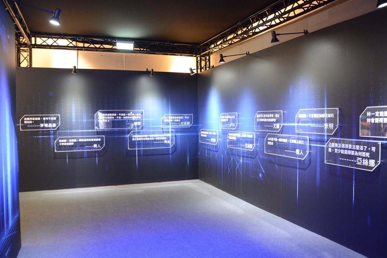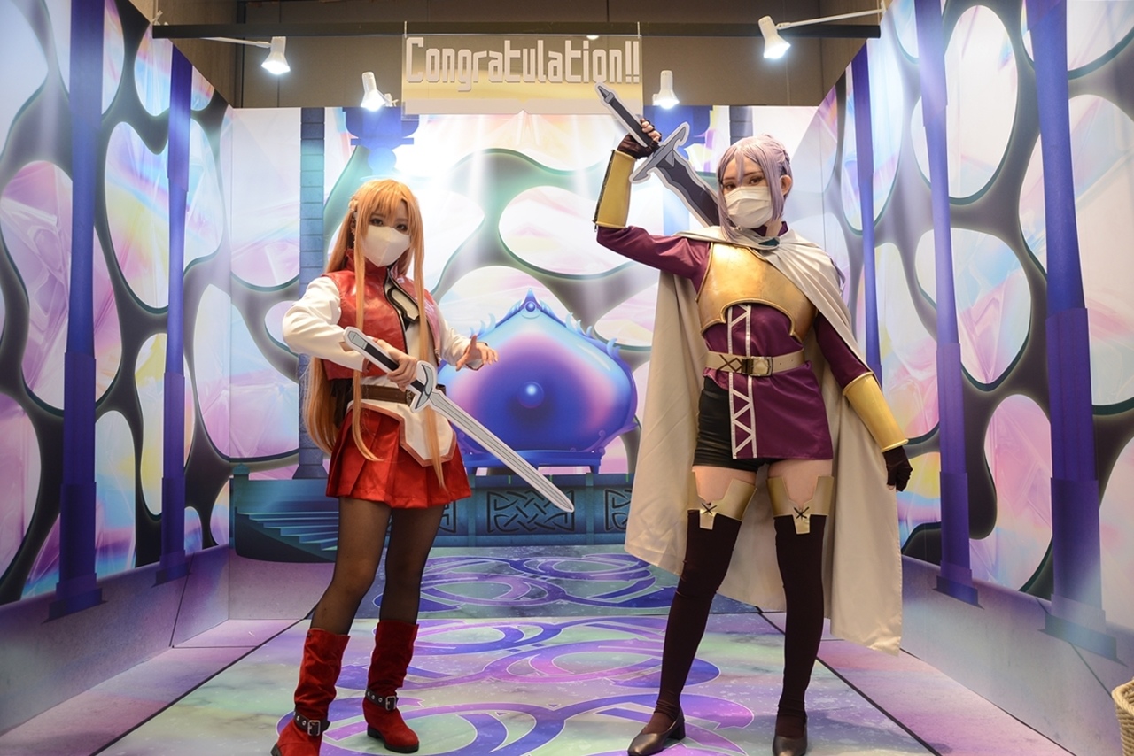 為了讓粉絲在展場中能夠留下各種回憶,又甚至是實地體驗進入《刀劍神域》的世界,主辦方特地規劃投影背景區和實景拍照區。投影背景區以街頭一景搭配明日奈的背影,宣告《Sword Art Online》正式營運的廣告就在電子看板上播放著;而另一邊則是進入艾恩葛朗特後,GM 宣告死亡遊戲正式開始的整面 ERROR 警示訊息,無論哪邊都讓人感受到壓倒性的魄力。實景拍照區則準備了桐人一行人成功攻略第一層 BOSS 後的對戰大廳,「Congratulation!」的提示還顯示在上面;還是一片祥和的「起始的城鎮」一景,也讓人心曠神怡,米特和亞絲娜便在這裡展開她們最初的冒險......。粉絲們絕對可以對每個場景的故事如數家珍,在這裡也留下與好友們的珍貴回憶吧!