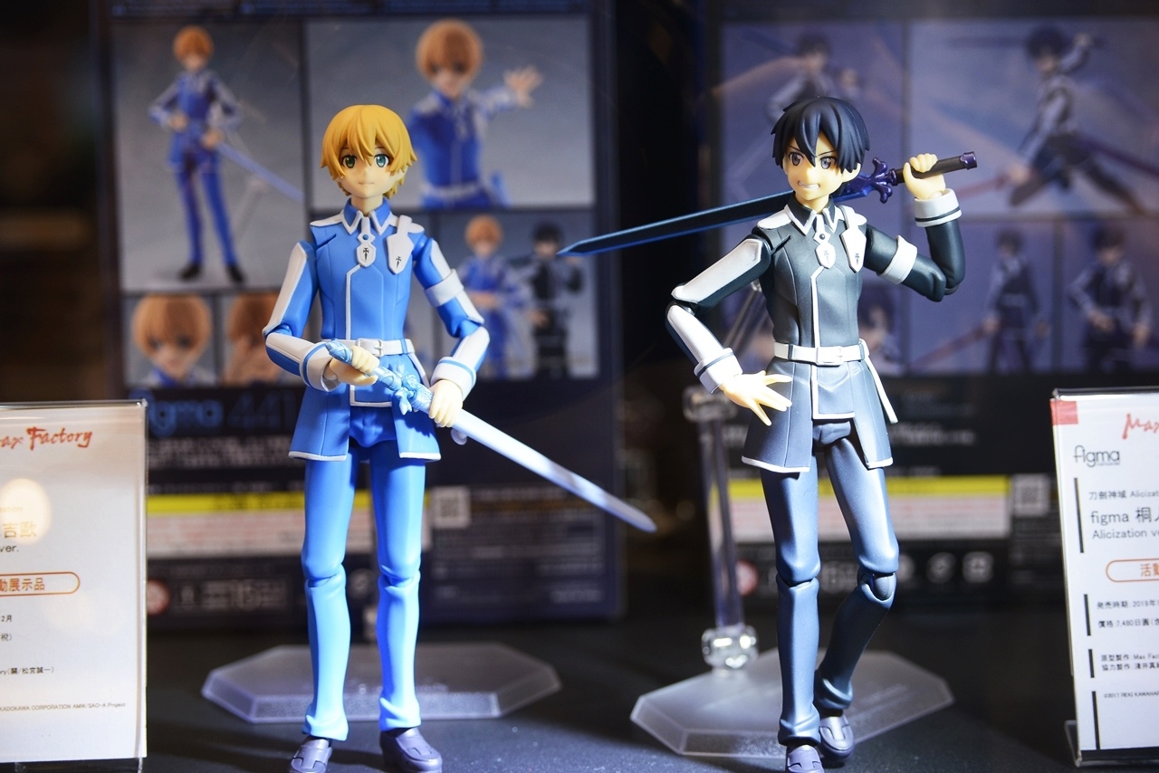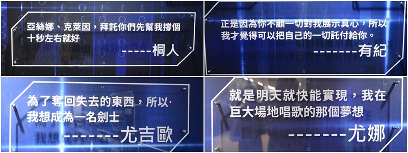 名言牆過後便是《刀劍神域 Progressive 無星夜的詠嘆調》的角色介紹及設定圖,而 1:1 的黑之劍士桐人和血盟騎士團副團長閃光的亞絲娜也在此處現身,其後還有特別從日本空運來台的《刀劍神域 Alicization》桐人、尤吉歐、愛麗絲三人所使用的武器展示,以及《刀劍神域 妖精之舞》被囚禁的精靈女王亞絲娜和《刀劍神域 幽靈子彈》中集冷靜睿智帥氣於一身的詩乃等 1:1 模型。雖然這些都是過去展示中曾出現過的展品,但能夠一次在同個展場中看到還是令人相當興奮!