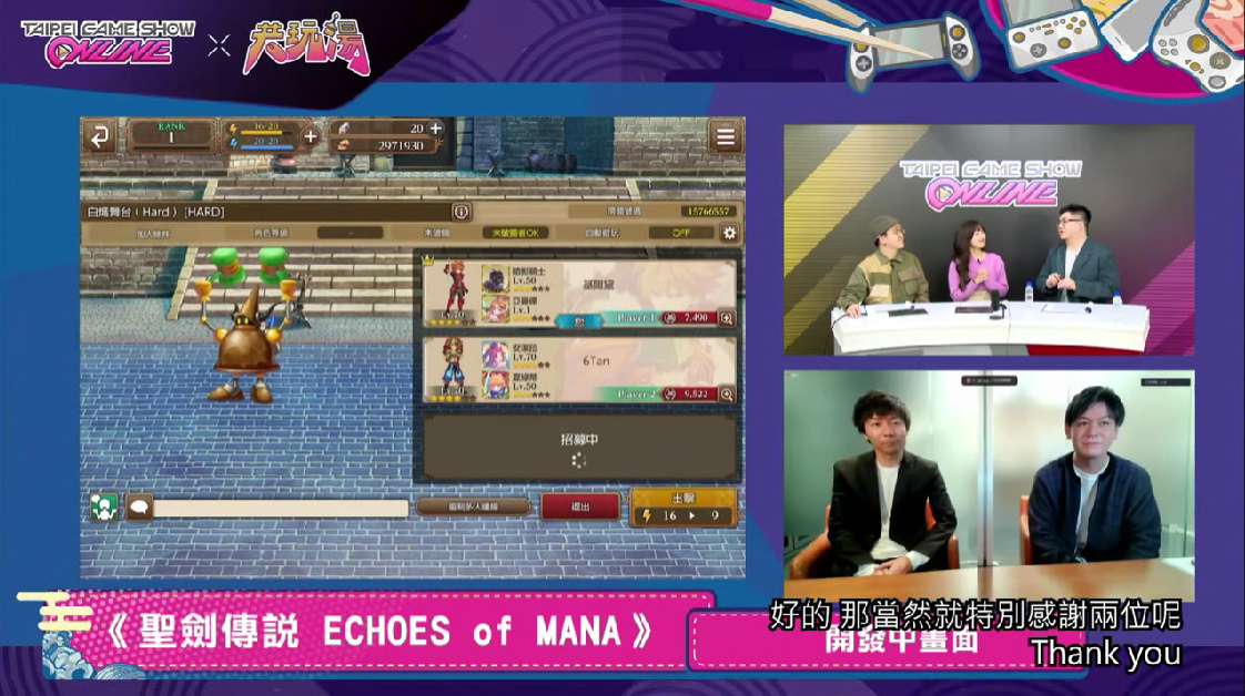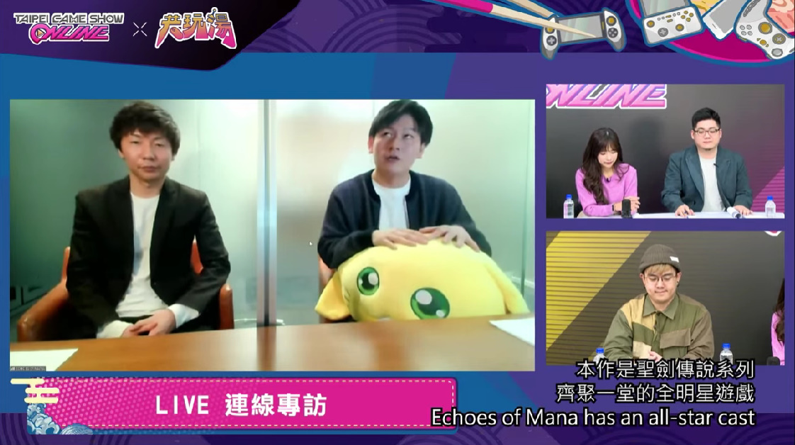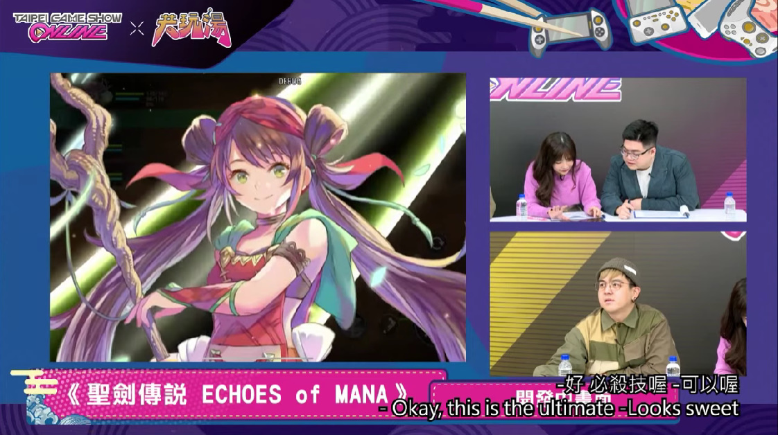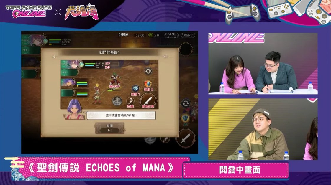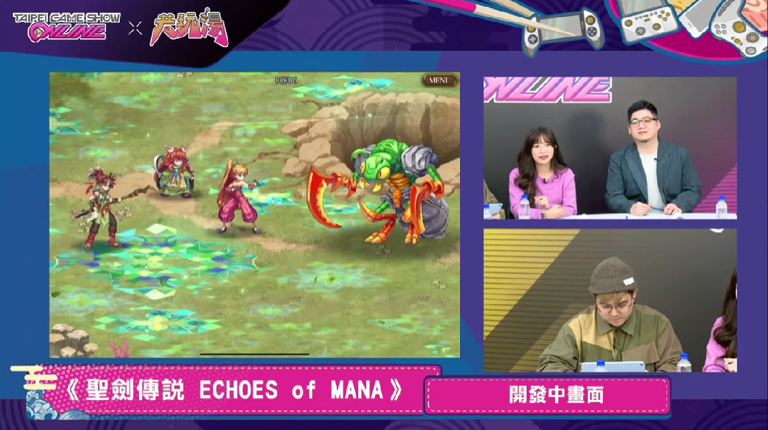 SQUARE ENIX 所開發的《聖劍傳說》系列動作 RPG 手遊《聖劍傳說 ECHOES of MANA》,今(22)在台北電玩展特別節目「2022 Taipei Game Show ONLINE」中,由主持人湯米與貝莉莓,和來賓 6tan 以及遊戲開發總監村田先生和製作人治田先生帶領玩家一起進入懷念的《聖劍傳說》世界!