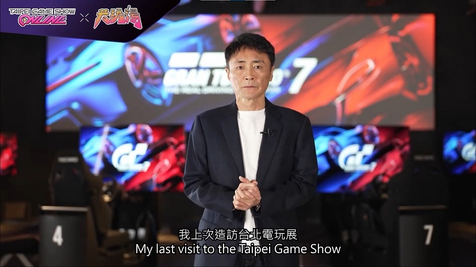 Polyphony Digital 製作人山內一典,雖然無法來台與大家見面,但特別跨海捎來問候影片,不僅以中文向台灣玩家問候,並表示自2017年造訪台北電玩展已經過了 5 年,非常感謝玩家對《跑車浪漫旅》推出25年來的長期支持。因此,特地為了亞洲玩家們推出「#MyGTStory」特別活動,請大家分享自己與《跑車浪漫旅》的點滴小故事;製作人現身的影片一播出讓聊天室的觀眾十分興奮,小湯更當場熱情分享自己開始接觸賽車的故事,大讚:「我開車的老師就是《跑車浪漫旅》!」
