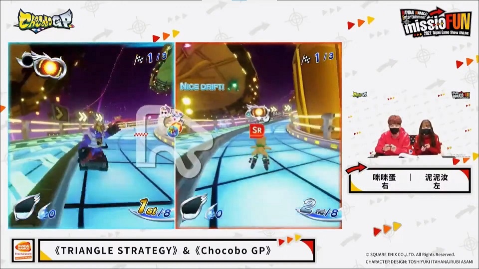 而節目壓軸則是將於 3 月 10 日的趣味競速遊戲《Chocobo GP》 萌萌亮相,人氣實況主咪咪蛋與泥泥汝趕在遊戲上市前搶先透過實機試玩飆起來。儘管事前做足準備的兩人解說得非常認真,但是戰場太過激烈,一路被電腦扔出的狀態道具砸得滿頭包,一路上狀況連連,惹得兩人各種驚呼;咪咪蛋發揮前職業選手的堅強實力,就算慘遭電腦圍攻照樣輕取前三名。兩人在最後對決階段以晚餐對賭,沒想到直呼苦手的泥泥汝竟然在最後關頭一路領先,讓後面苦追的咪咪蛋直呼不可思議,只能甘拜下風。