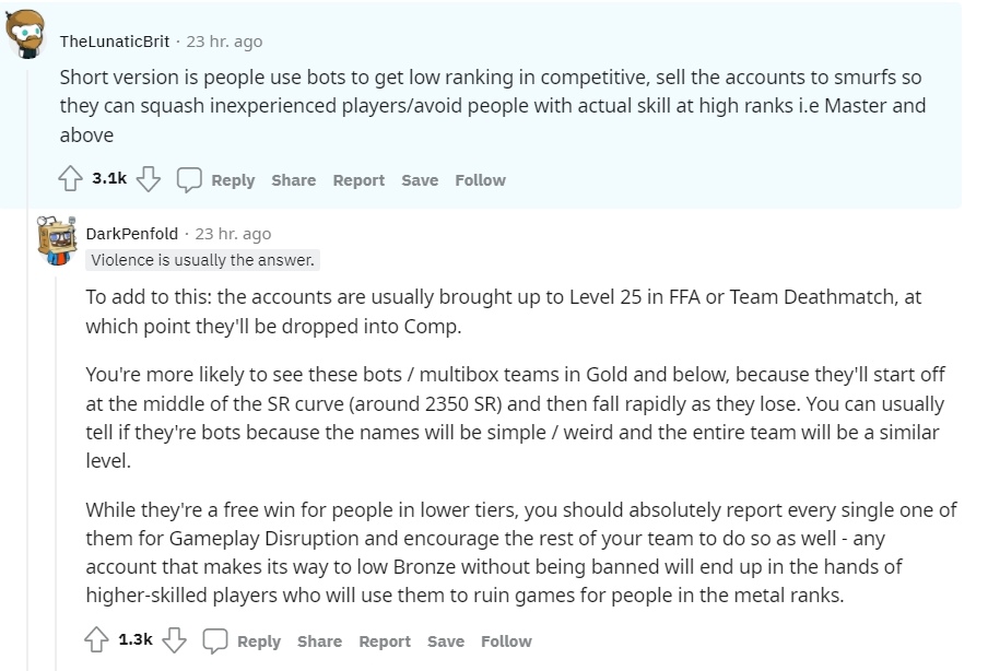 根據不少網友所給出的回覆,這類腳本帳號基本上會先在一般對戰模式出現,等級達到 25 之後在集合成 6 人 Bot 小隊進入競技模式,持續輸掉對戰拉低帳號的競技牌位,設法把牌位拉到最低區域。一但達到了最低牌位後,在將這群帳號拋售出去轉手;而購買此類帳號的買家多半會是高階牌位的玩家,目的就是藉著高牌位的技術來虐殺位於低牌位的對手。