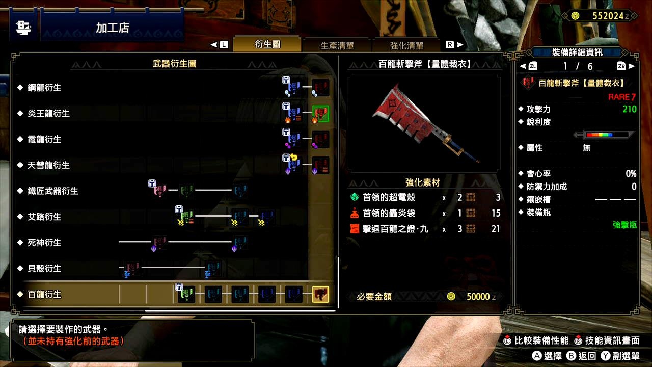 百龍強化則是攻擊力和弱點特效[屬性]挑一個你喜歡的,弱點特效[屬性]的效果是面對元素屬性肉質25以上,就元素屬性增傷30%,上面幾個弱火又弱斬切的都可以很輕鬆的滿足發動條件