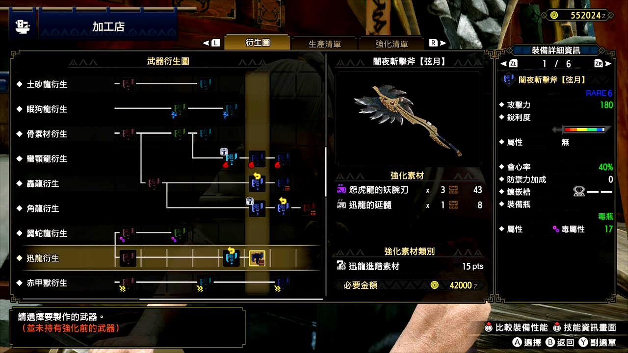 優先級:高速變形、迴避距離提升 選配方案 A:弱點特效、超會心、利刃或剛刃研磨二擇一、砥石高速化 B:看破盡量拉高、超會心、挑戰者1、達人藝、利刃、剛刃研磨三選一、砥石高速化,對耐力控管有信心可追加精神抖擻 點評: A組適合可以讓你一人獨占弱點的單挑場合。 B組適合團戰,在 RISE 中,挑戰者只出 1 等的性價比最高,甚至因為種種裝備和插槽的因素,在實戰上 1 等的性價比會遠遠高過滿等,尤其挑戰者提供的攻擊力 UP 還會被迅龍武器的爆率和白斬雙重增幅,非常划算,挑戰者1和迅龍武器是BEST MATCH。 要是你的護石很神,可以考慮加減攻擊力UP上去,同樣會被爆率和白斬再放大,同樣支援怪力種子和鬼人藥,所以在你資源行有餘力下的話,這些提升攻擊力的耗材也是多多益善。 同樣的,百龍技能選的攻擊力強化一樣會被爆率和白斬雙重增幅,所以除非你有要配合高爆率發動達人藝或超會心,不然選攻擊力強化 3 絕對沒錯,即便你真的需要迅龍劍斧百龍技能選會心 2,說實話也應該再重新作第二把迅龍劍斧,直接放棄,為了小小的會心2蓋掉攻擊3是不太明智的做法。 超會心不用強求滿等三等,事實上由於種種的邊際效益,和裝飾品技能珠之間的互相排擠爭奪插槽,在性價比考量上,以劍斧裝備插槽使用方式、實務層面來說最划算的超會心是只出一等,所以即便出不了三等超會心也不用覺得可惜 當然,如果是以刷TA競速為目標的獵人,那你性價比就不是你該考量的首選,乖乖拉高超會心。整體來說,如果你已經有一定的素材儲備量,想要跨足劍斧這個領域,迅龍劍斧很適合作為你轉行的第一把劍斧 |
