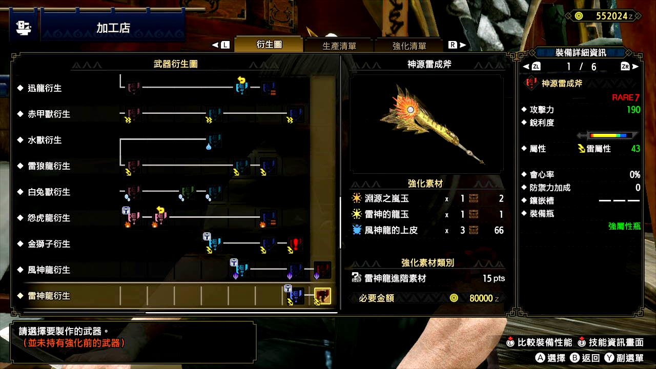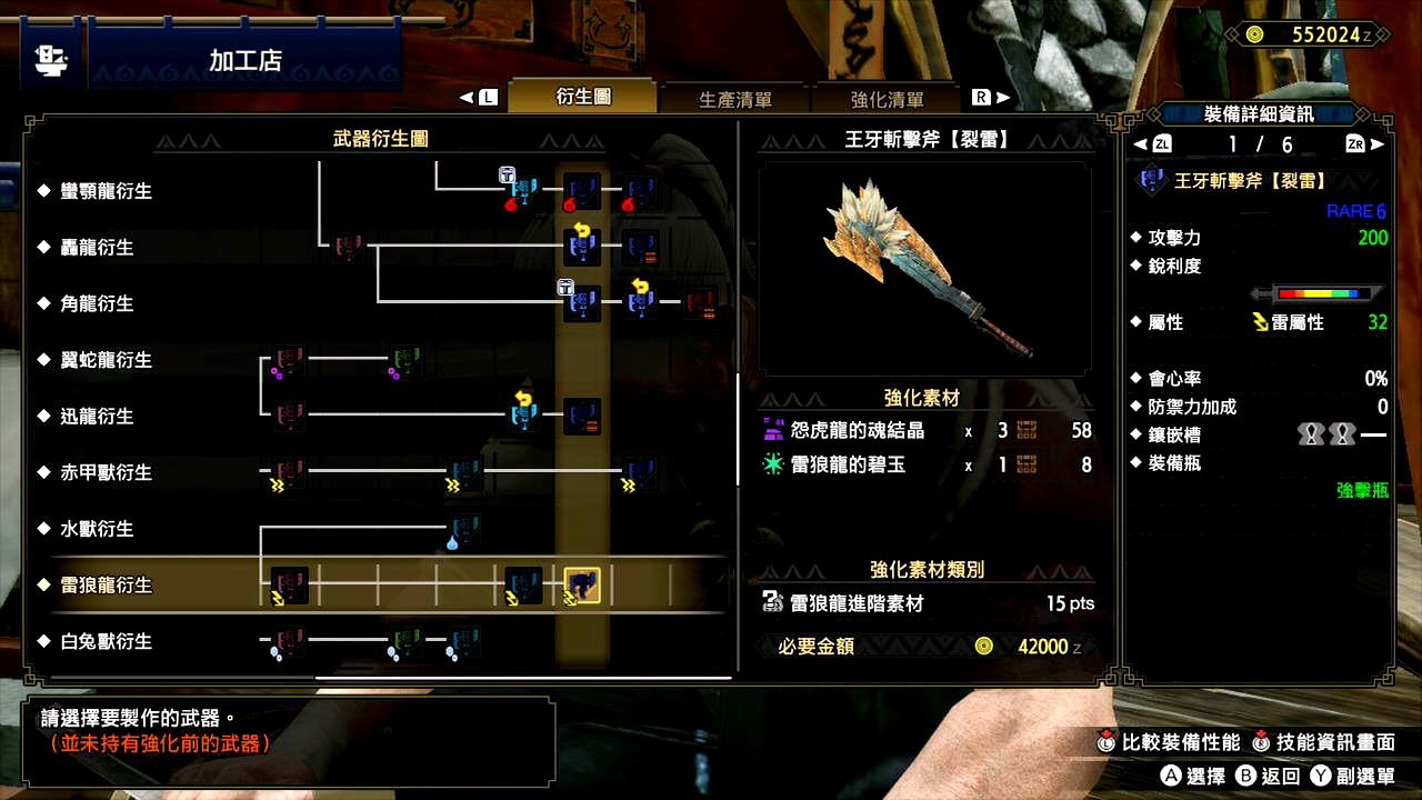 雷狼劍斧: 原生 40 藍斬、匠 2 出白斬,再上強擊瓶,擴充性良好 32 高雷傷,還有兩個一階洞讓再撐兩次雷屬性強化 |