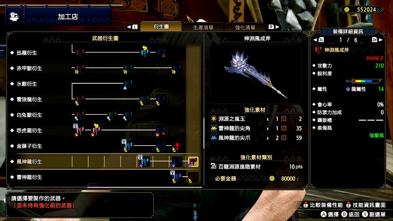 風神龍劍斧、長到離譜的 120 藍斬、強擊瓶,堪用的 14 龍屬性 看下去除誇張的長藍斬以外,並沒有太多特別出彩的亮點。但實際上強項不是單純的傷害面,而是對攻擊技能的需求和依賴非常低,尤其攻擊力 210 無負會心,在強擊劍斧裡是頂天水準,可圈可點,在團戰中的大亂鬥環境,依然可以有相當穩定的輸出和表現。上面所有的劍斧,都還要在各種銳利度技能上擇一備上,風神劍斧連銳利度技能都可以省起來 |