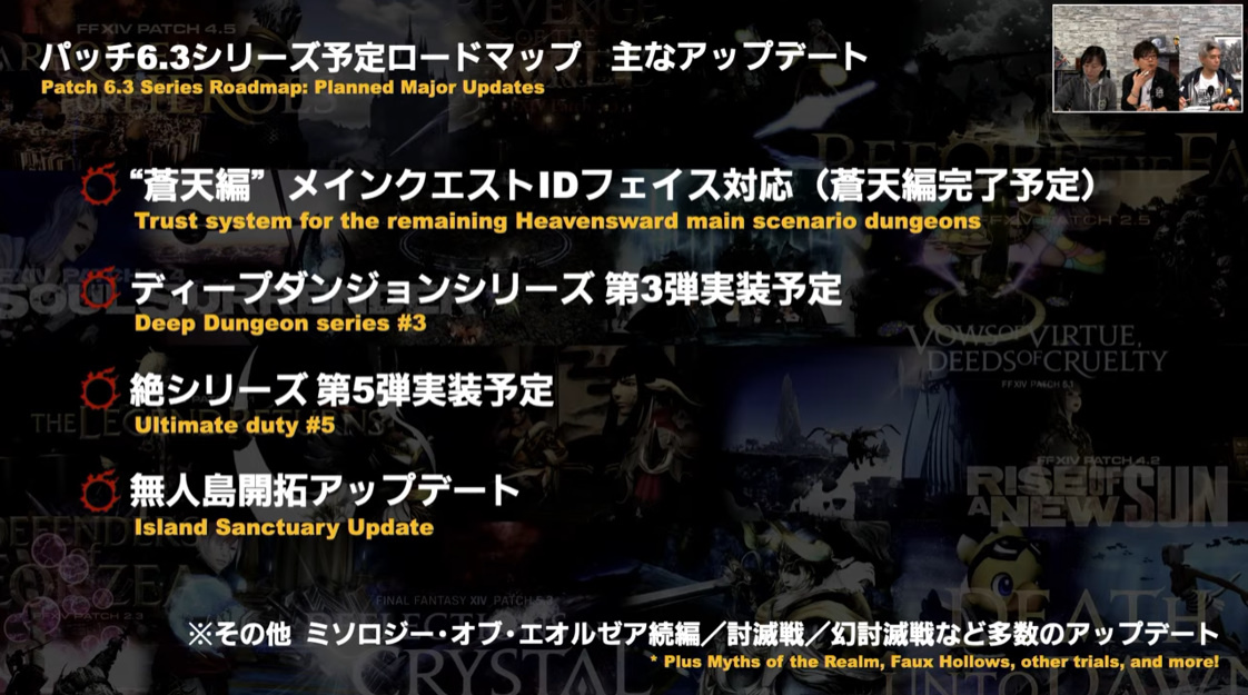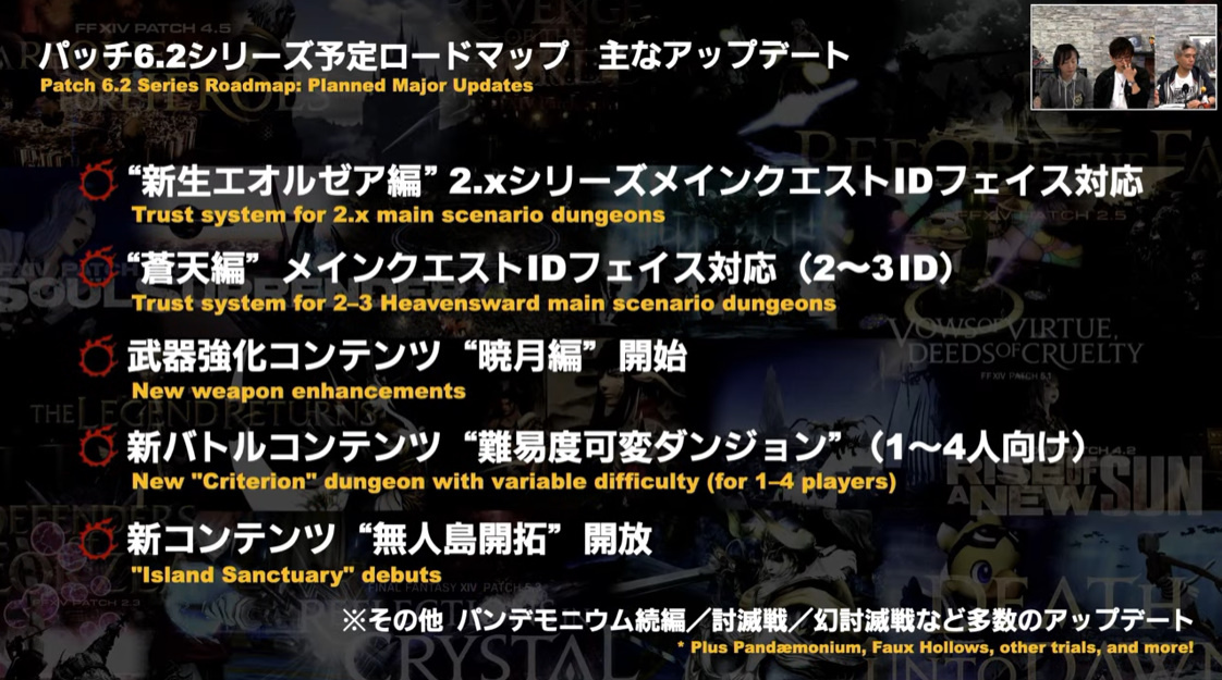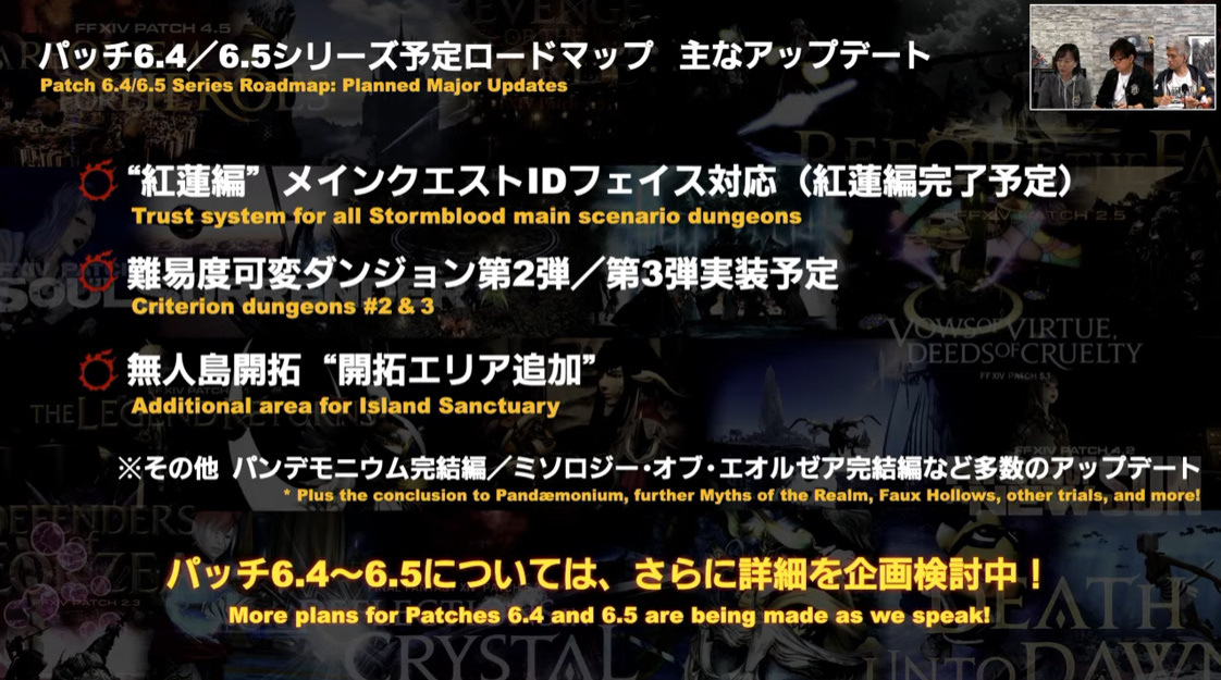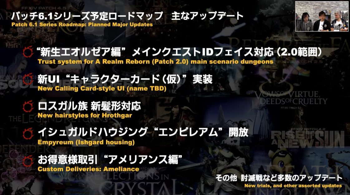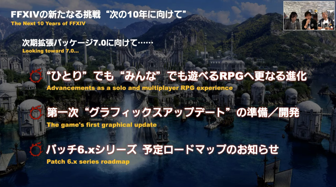 首先是對於下一個資料片「7.0」的願景,包含對於「個人」或「多人」RPG 能有更進一步的強化與畫質上的升級和開發,以後為了因應每個玩家的需求,未來會強化單人/多人遊玩內容,在單人遊玩體驗方面,可以帶 NPC 一起挑戰副本的「親信戰友」(フェイス)系統,將能適用在所有主線副本與四人討伐戰,在 6.1 版本更新後會更新「新生篇」的所有副本與討伐戰(除去八人副本,預計 7.0 後更新),而其他篇章會隨著後續的版本更新跟進。