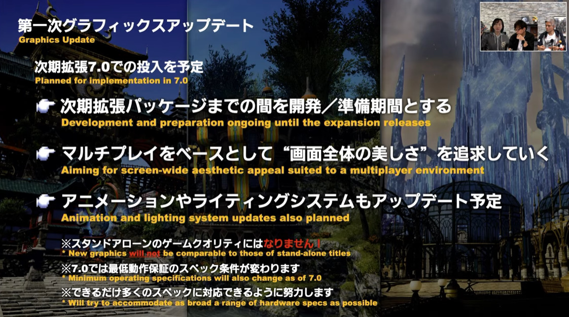 再來是畫質的提升,考慮到《FF14》未來想成為一個長久的 IP,隨著時代與科技的進步,官方決定提升遊戲畫質,目前遊戲內的素材太多需要除錯跟升級,所以畫質的調整會是階段性進行,預計在 7.0 出來前會持續開發與調整,而硬體要求吉田表示會盡量壓低條件讓所有平台都能跑,對此比較需要注意的是 PS4 的用戶,官方有考慮在某次版本更新中針對 PS4 版做一次強化。