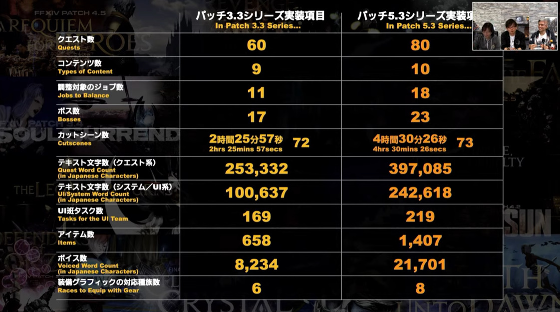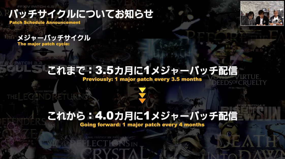 由於未來更新項目眾多,加上畫質的提升以及伺服器轉移等系統上的強化,吉田表示未來的更新時程將會從每三個半月一次的速度增加到四個月,多出來的兩周會用在實裝與調整上,若遇到暑假或跨年期間會再加一周的時間,雖然他們也有增加人力,但是想做的東西太多工作量也變大,才會決定延長更新周期,希望接下來的十年大家能與《FF14》一起努力!