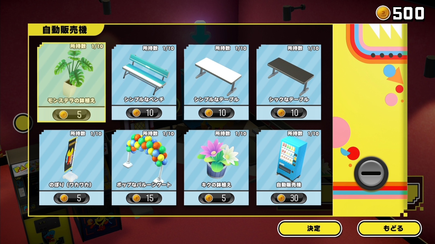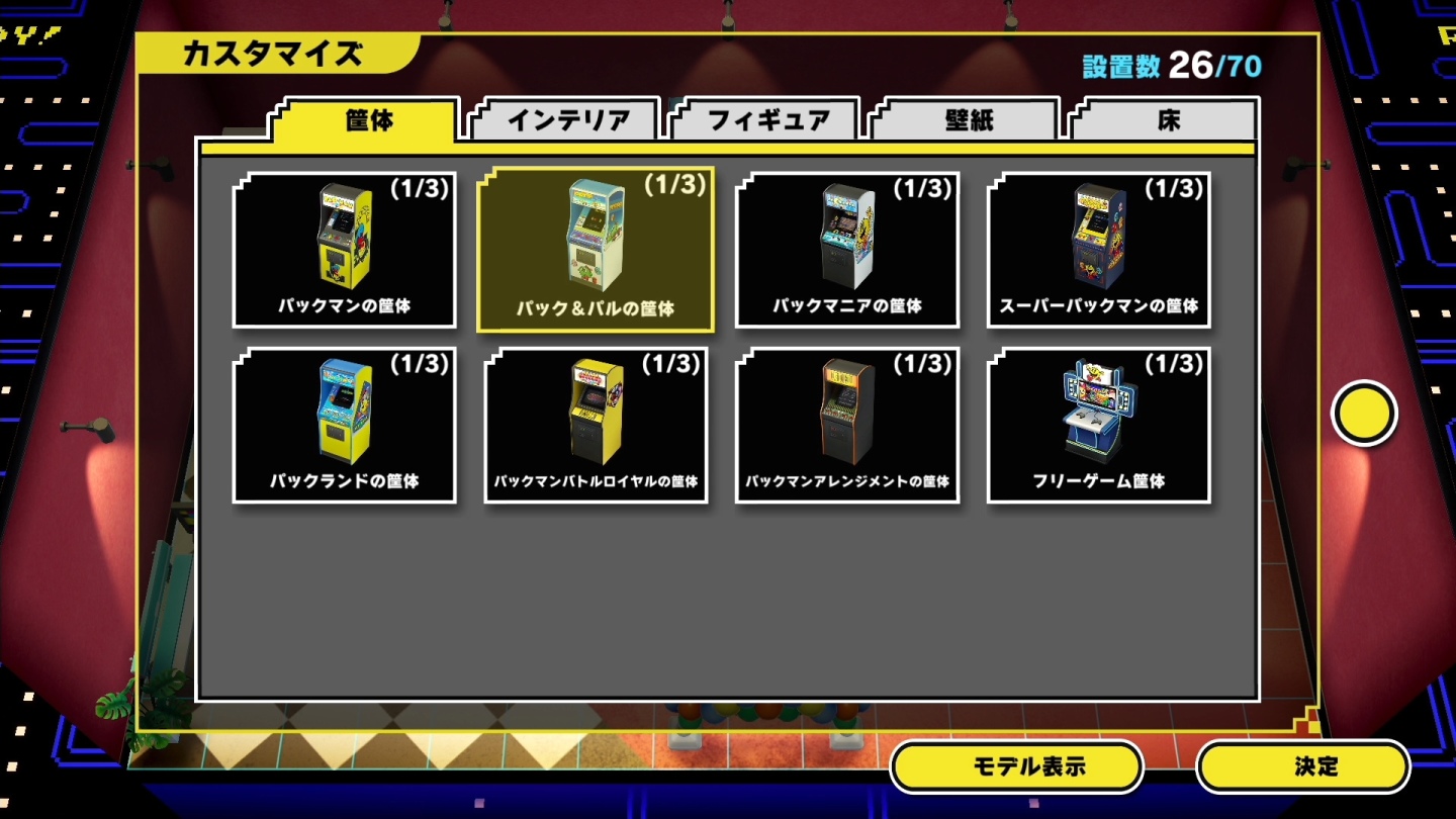 透過完成各遊戲任務,玩家就可以增加持有的 ARCADE 機台數量、壁紙及地板的樣式,並獲得可於遊戲中心點唱機進行設定的 BGM,其樂曲內容包含收錄作品的 BGM 以及《PAC-MAN》的原創樂曲。另外,自動販賣機內也將添加新的室內小物並每日更換販售品項。玩家也可使用遊戲內的金幣遊玩 GASHAPON 獲得各式模型。