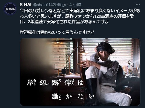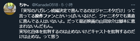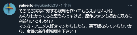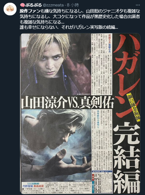同個推主另外也提到:「聽到是真人版原作粉絲早就一哄而散,山田涼介的粉絲則是感嘆就不能給他好一點的劇本嗎,