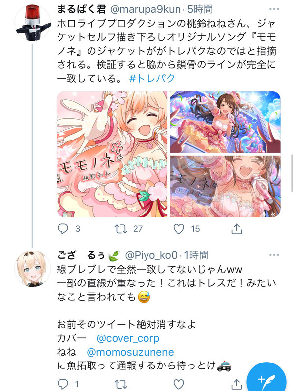 Hololive 五期生「桃鈴音音」(桃鈴ねね),在 3 月 2 日舉行了生日直播,其中預定販賣的周邊商品被觀眾發現有描圖嫌疑,針對此事 Cover 官方與桃鈴自己分別發出道歉聲明。