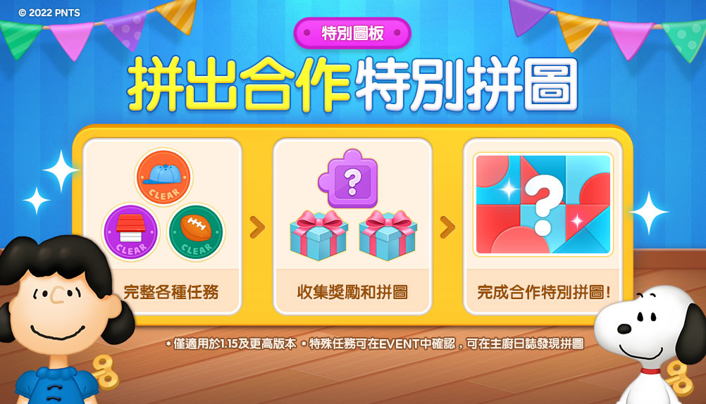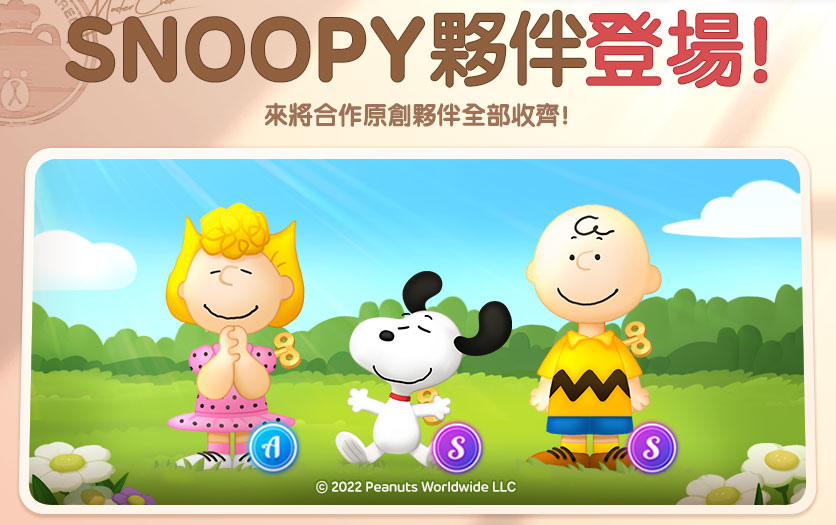 《LINE 熊大上菜》與廣受全球各年齡層族群喜愛的「SNOOPY」聯手舉辦的活動首次開跑。本次活動中,「Snoopy」和「Charlie Brown」等超人氣角色會化身為超可愛的限定夥伴登場,還有以「PEANUTS」角色作為主題的期間特別關卡等你來挑戰,更別錯過可以獲得合作夥伴「Sally」的限定活動喔!