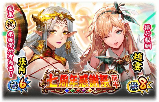 收集通關「七週年感謝祭」活動關卡時可獲得的週年點數至一定數量,就可獲得達成獎勵5★「張角」。另外,點數累積數進入排行榜前段者則可獲得5★「趙雲」。