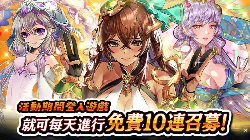 活動期間,天天都可免費進行10連召募,且在此10連免費召募中,天賦解放5★「関羽」、「ホウ統(龐統)」與「荀彧」等角色的召募機率將提升。