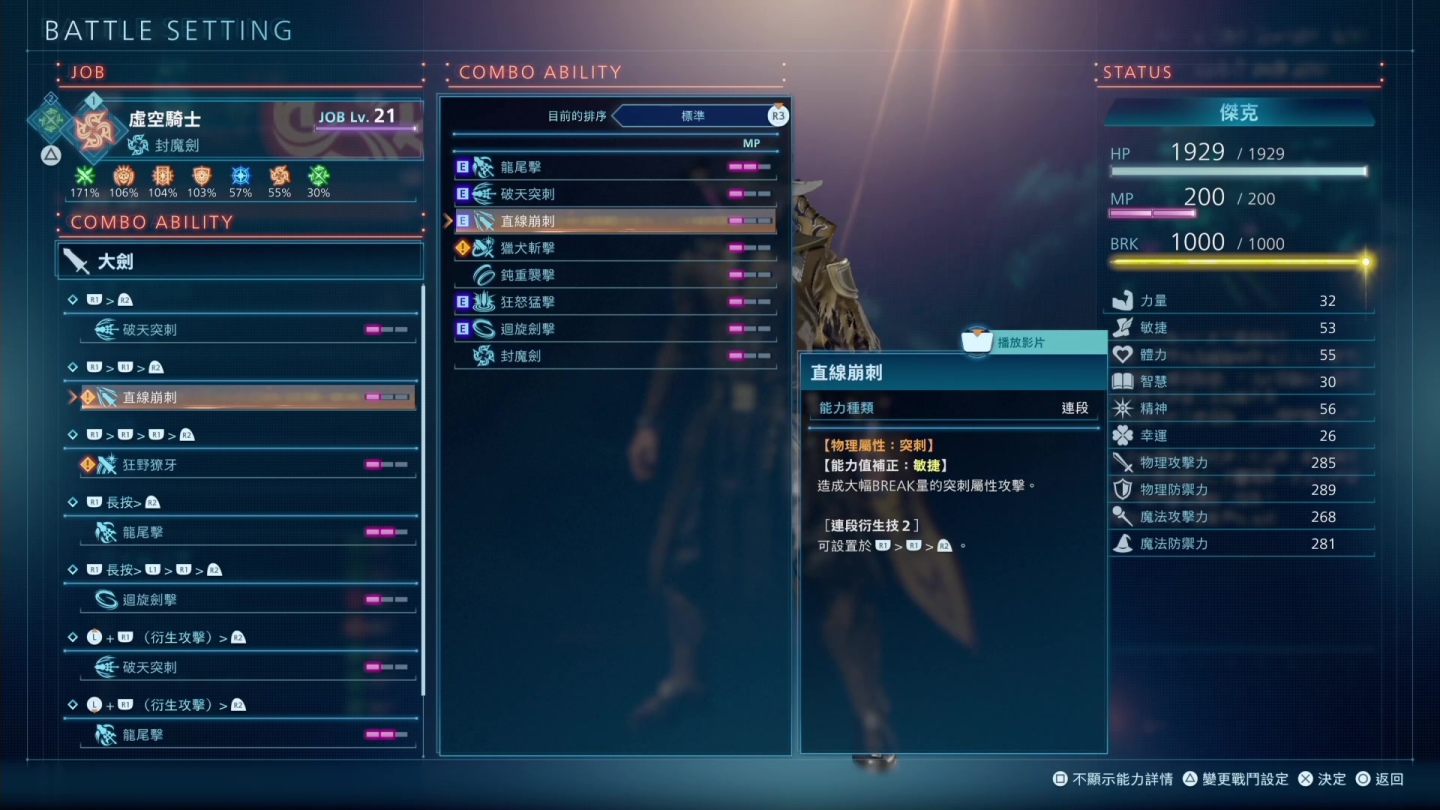 玩家 BREAK 量表被攻擊就會減少,但不會感到自身脆弱,因為透過切換職業,等同擁有兩條 BREAK 量表可運用,多重職業的好處也從此建立起,隨著升級獲得的點數可以在各職業學習到連段技能、指令技能、被動技能,可以在戰鬥設定方面選擇三種指令技能、以及搭配不同武器的連段觸發技能。