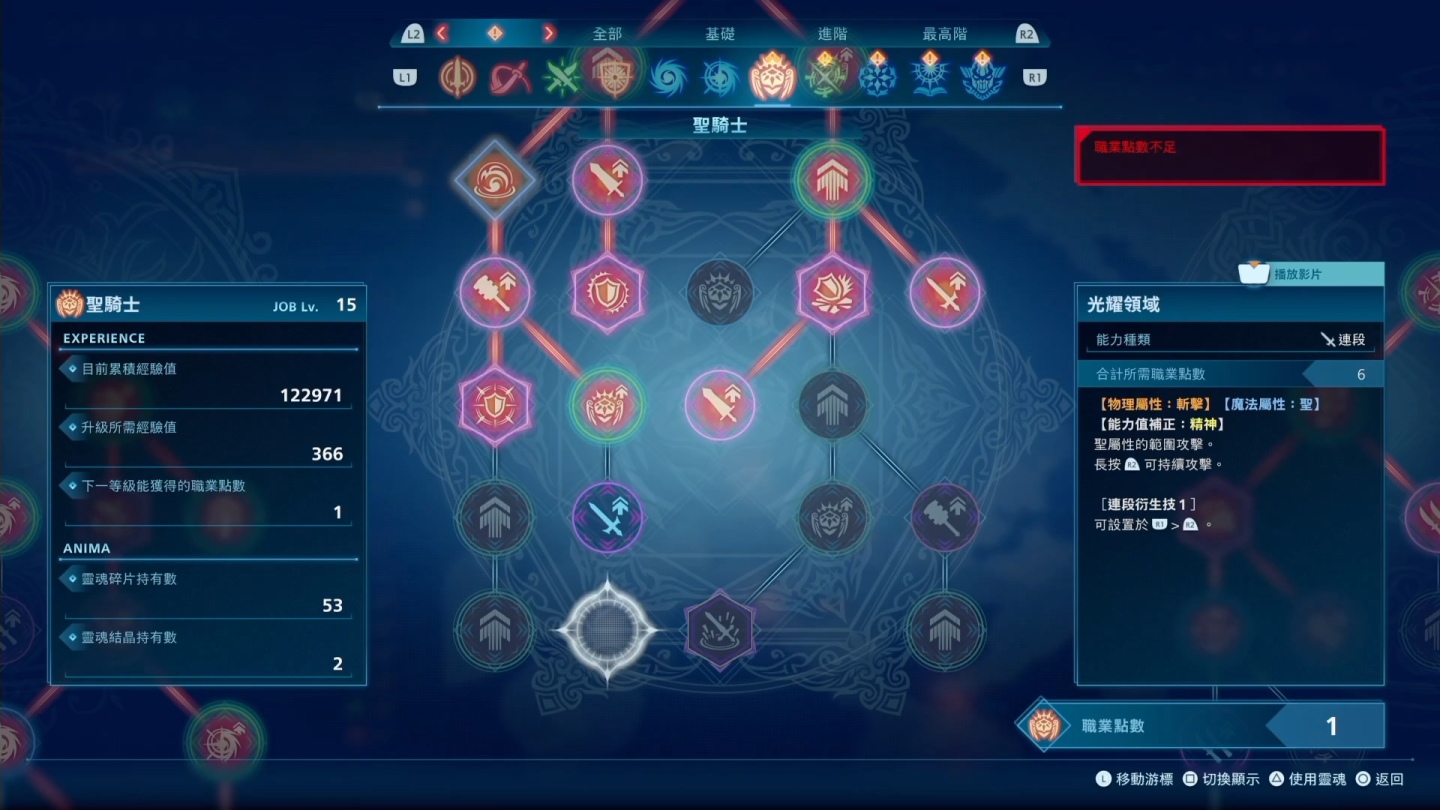 雖然切換職業後不能使用該職業的特殊技能算是來自《FF》的轉職傳統,但是從職業習得的「指令技能」就可供跨職業使用,因此習得最高階職業時,依然可以把過去好用的基礎、進階職業指令技能搭配在指令技能欄位,而且根據不同職業的契合度可以獲得複合職業的屬性獎勵能力,練進階職業時相關的職業等級依然會持續提昇,加上任務獎勵會獲取「靈魂碎片/結晶」可以提昇單一職業等級,讓編輯在遊戲中期就幾乎完成了全職業解放。