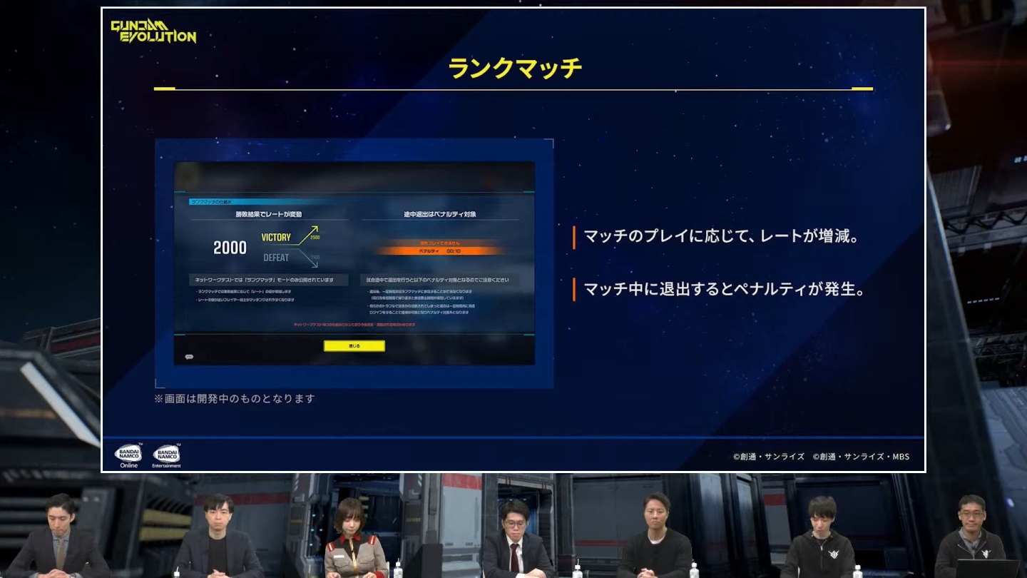 在這次的測試中,將會提供「Rank Match(ランクマッチ)」階級配對的方式讓玩家們來進行遊戲體驗。隨著玩家們的勝敗成績,玩家的階級將會有所變動,在階級配對中,將會依照這個階級讓玩家們來挑選與自己階級相近的玩家進行配對。除此之外,本次測試還將會提供玩家針對機體與武器外觀來進行自訂,讓玩家們可以針對自己的愛機如 G-3 鋼彈、夏亞專用薩克等機體加入自己原創的設計,改變成自己原創的專用機登場。除了機體外觀外,就連武器外觀也可以讓玩家自由自訂變更,加上可自由裝飾在機體與戰場上的各種徽章/貼紙,玩家們屆時務必要來體驗看看。