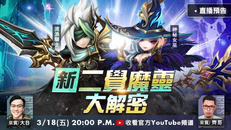 為了讓所有召喚師更快認識全新二次覺醒的魔靈「流浪騎士」和「神秘女巫」,《魔靈召喚》的知名實況主「大B」和「齊哥」將於 3 月 18 日晚間 8 點在《魔靈召喚》官方 YouTube 頻道進行直播,介紹並且試用五種屬性的「流浪騎士」和「神秘女巫」,想要搶先一睹全新二次覺醒魔靈強大能力的召喚師千萬不要錯過!
