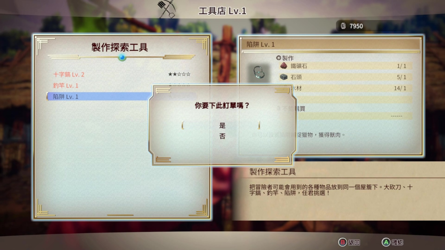 收集物資來復興城鎮是相當核心的一塊,從玩家的角色能力開始,還有動作指令上的進階都與城鎮機能相關,在採集物資上要取得十字鎬、釣竿等採集道具也都是依靠此而來,比較有趣的是強化武器到達一個層級後,就可以為武器隨意取名。