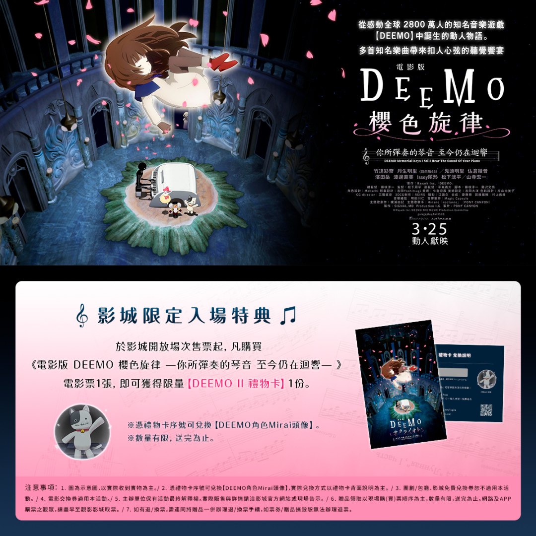 改編自臺灣知名音樂手遊的動畫電影《電影版 DEEMO 櫻色旋律 —你所彈奏的琴音 至今仍在迴響—》3 月 25 日(週五)在臺上映! 故事講述失去記憶的小女孩 Alice(竹達彩奈 聲演),某天突然降落在一個神祕的城堡裡,遇見了居住在城堡裡的神祕存在.Deemo,以及不可思議的住民們。為了找回小女孩的記憶,Deemo 藉由鋼琴的音色促使旋律之樹成長,編織出一個溫柔又淒美的奇幻故事。