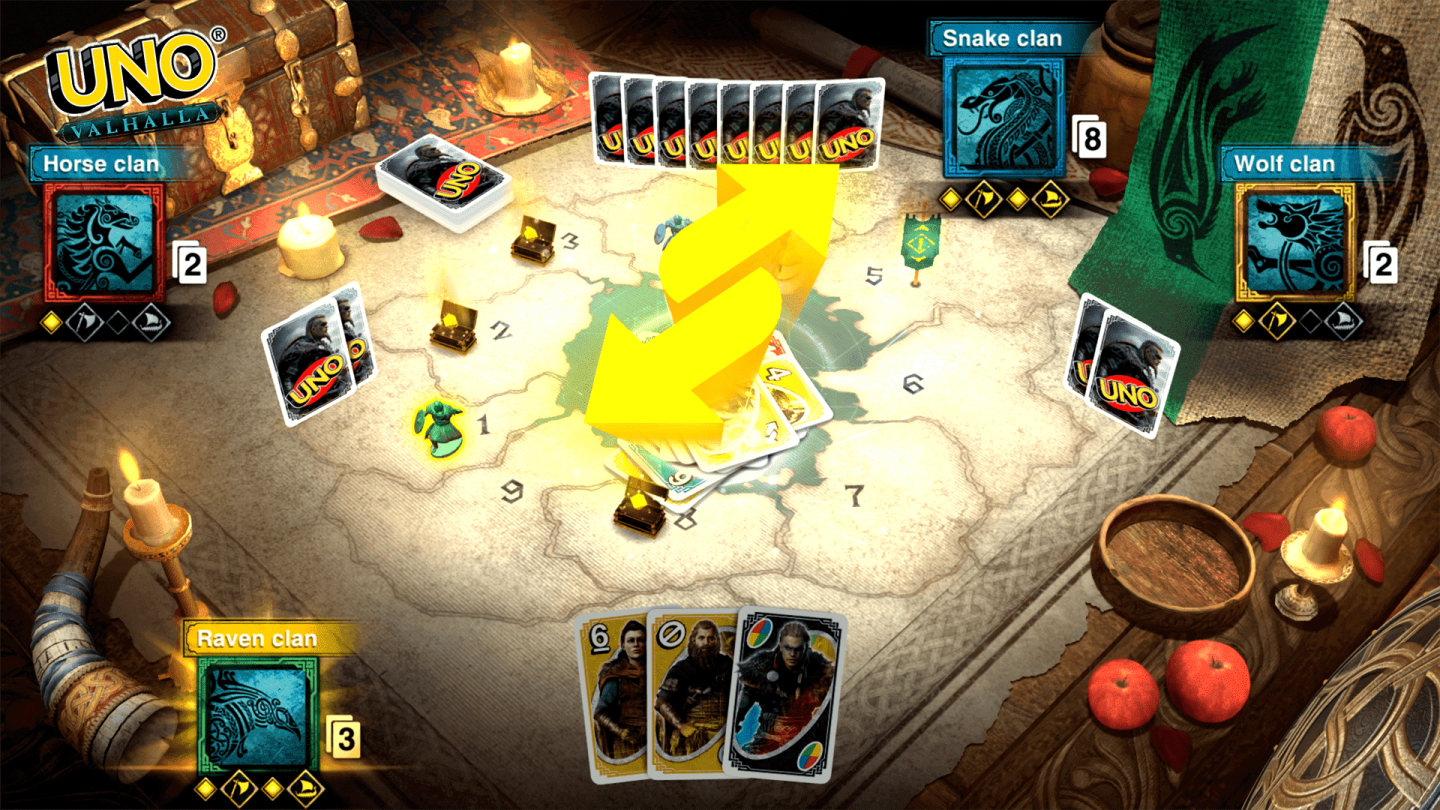 遊戲盤首次在《UNO》裡成為遊戲的一部分。玩家可以明智地打出他們的卡牌,在遊戲盤上遊走,收集珍貴的貨物,解鎖獨特好處。靠著貨物這種新資源,玩家能與對手進行卡牌戰鬥來拖延他們,或者解鎖長船被動效果,一次打出多張卡牌。在探索過程中,玩家還會遇到一些會改變遊戲玩法的隨機事件,例如「重拾榮耀」事件讓玩家的貨物數量能與貨物數最多的對手玩家相同,而「劫掠」事件則讓玩家從目標玩家那裡竊取兩個貨物。本擴充內容也引入了全新的「渡鴉悉寧」卡牌,讓玩家能前往他們選擇的地區並領取他們應得的獎勵。