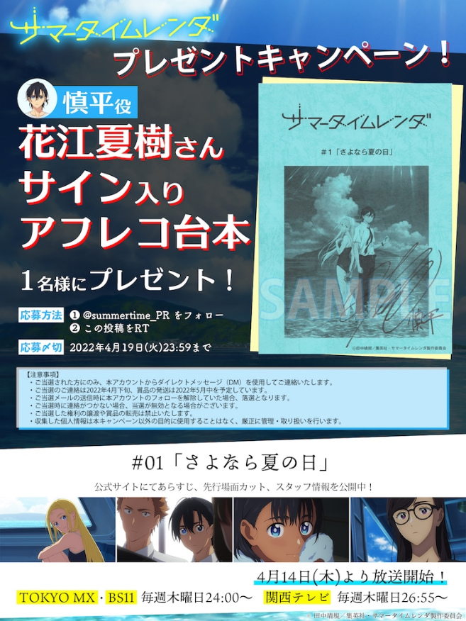 官方推特在開播前就舉行抽獎活動,有機會獲得聲演網代慎平的聲優花江夏樹親筆簽名的配音台詞本。