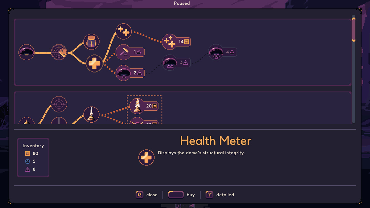 玩家在遊戲中,可以透過挖掘資源來強化主角或基地的裝備,例如像是提升噴射背包的移動速度與搬運能力,或是強化鑽頭挖地速度來提升挖掘效率,或是提升基地防衛能力或是武器威力,讓基地能在敵人攻擊下撐得更久。