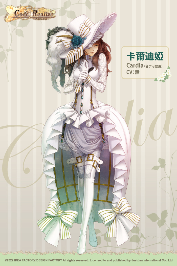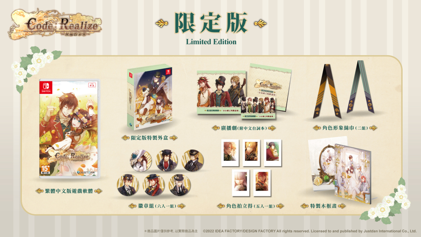 | 產品資訊 遊戲名稱:Code:Realize〜祝福的未來〜 遊戲原名:Code:Realize〜祝福の未来〜 遊戲類型:女性向戀愛冒險類 開發商:Idea Factory/Design Factory 發行商:傑仕登股份有限公司 香港地區總經銷:Game Source Entertainment 對應平台:Nintendo Switch™ 發售日期:2022 年6月23日 建議售價:一般版 NTD.1,790 限定版 NTD.2,990 語音:日語 字幕:繁體中文 年齡分級:輔15 |