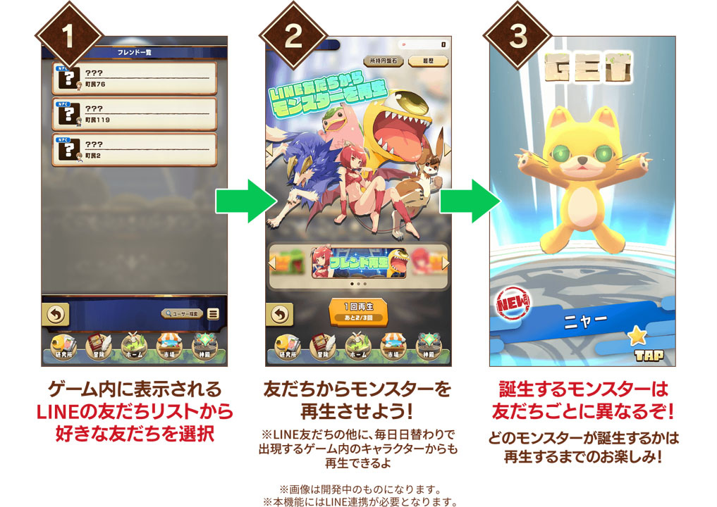 這次的「好友再生」,是讓玩家們可以透過 LINE 好友的「人們之間的聯繫」,來誕生取得新的怪物的要素。簡單來說,玩家可以透過將 LINE 帳號與遊戲進行連動來取得新的怪物。實際操作上,當玩家將 LINE 帳號與遊戲連動後,在遊戲內就會顯示玩家的 LINE 好友清單列表,玩家可以從中選擇自己喜歡的朋友,藉此來誕生新的怪物入手。而除了可以從 LINE 好友來取得怪物外,玩家也可以透過遊戲內每日輪替登場的角色來取得新的怪物,至於會誕生怎樣的新怪物,則會採隨機方式,玩家可以來多加嘗試挑戰,看最後到底會有哪些怪物出現!