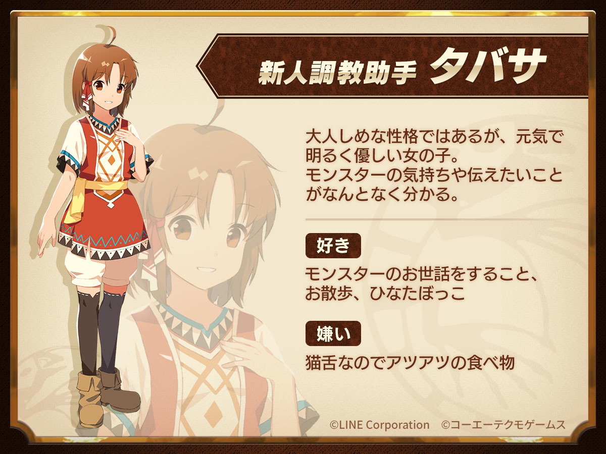 而除了公開新的好友再生系統外,這次官方也公開新 NPC 角色「塔芭莎」與玩家們見面。塔芭莎是玩家在進入遊戲後,會協助玩家熟悉遊戲內容的新人調教助手。性格陳熟穩重,充滿精神又開朗溫柔的她,總是能很輕易明白怪物們的心情或是想傳達的事情。而她在遊戲內將會與玩家們有怎樣的互動,就等屆時玩家親自來遊戲內與她互動體驗囉!