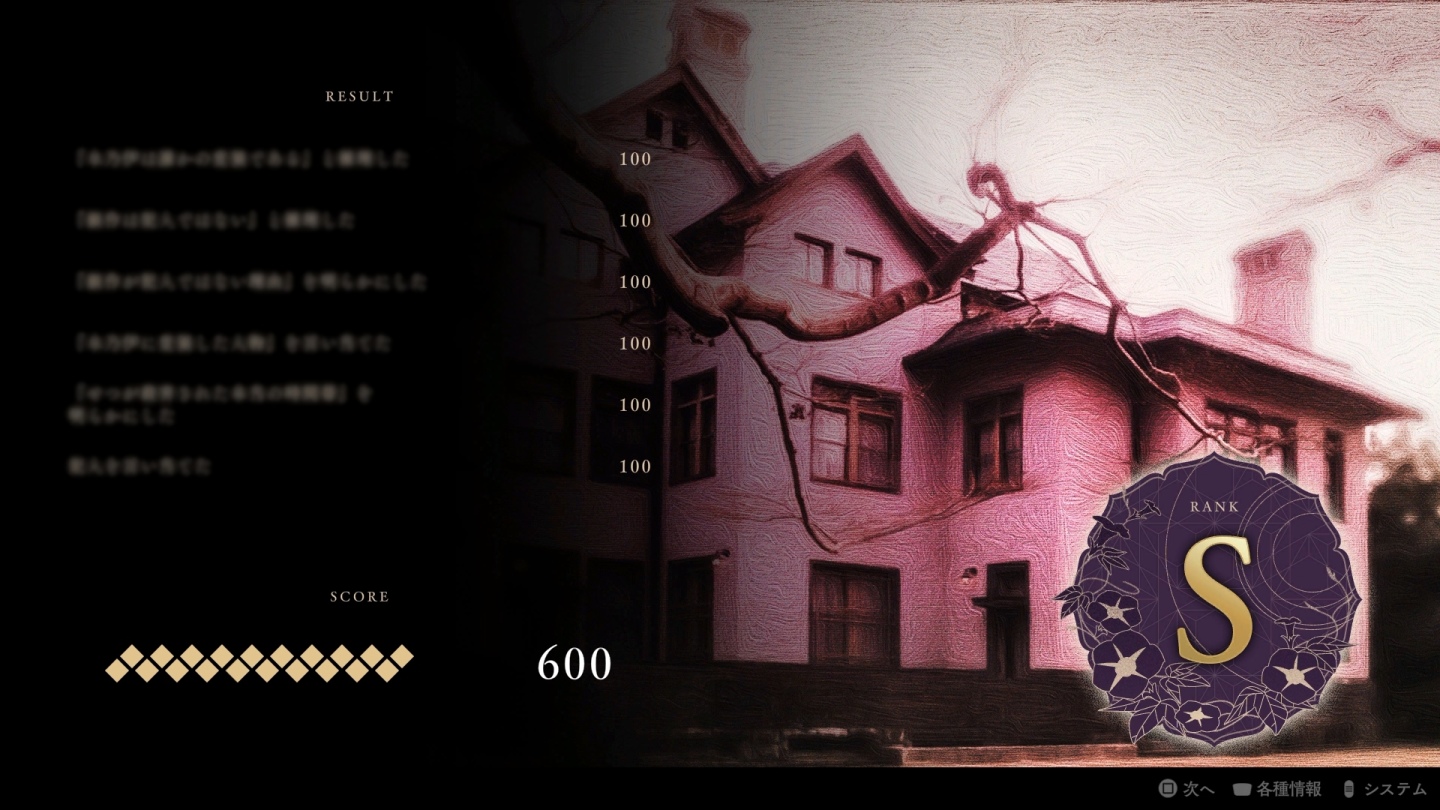 此為對玩家在各章中的推理進行評價的系統。對自己的推理能力有信心的玩家,努力來挑戰獲得最高評價吧!(※推理評價不會影響故事發展。)