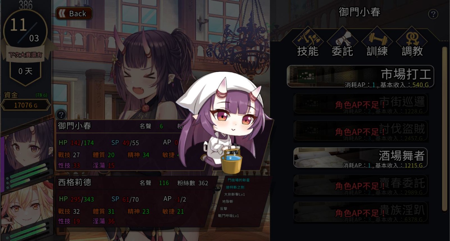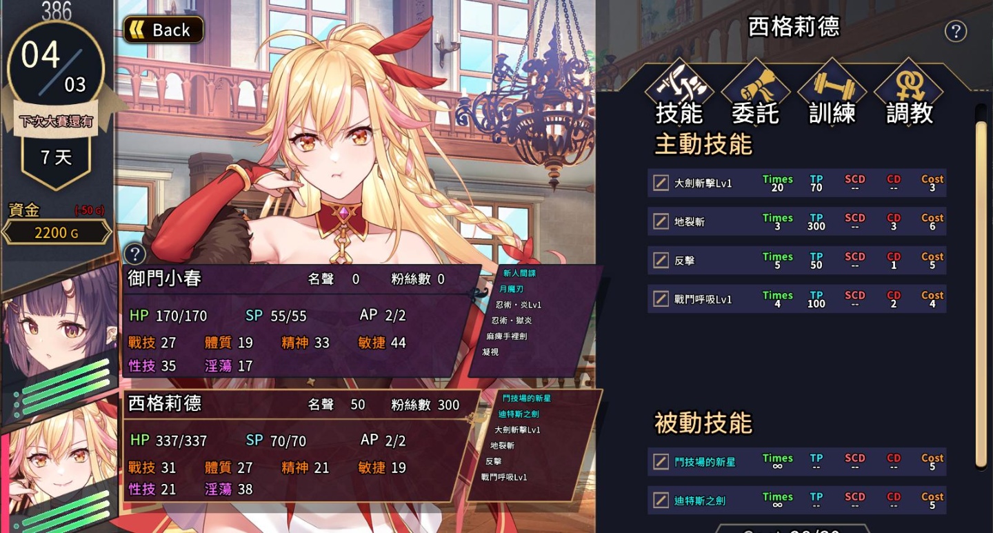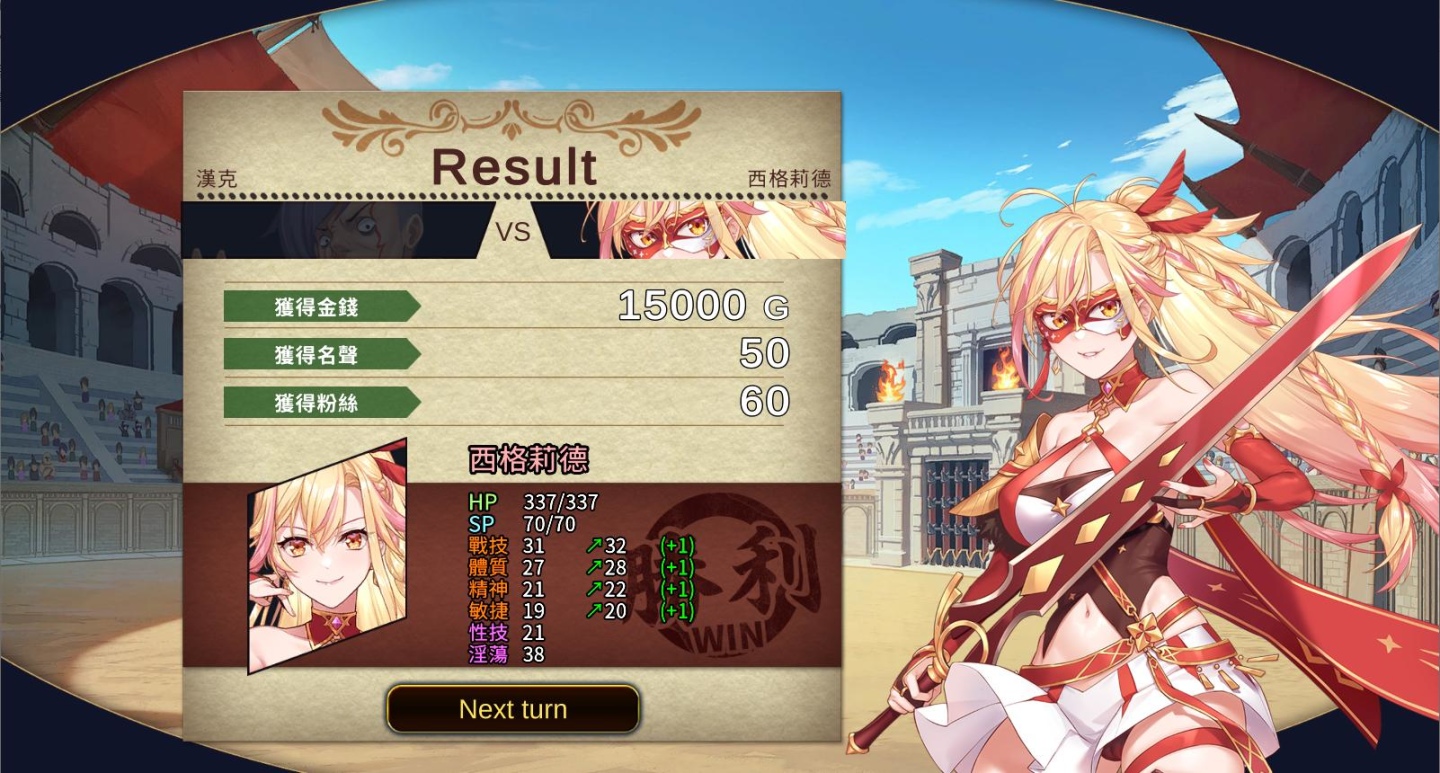 這次的內容將分為委託、訓練、調教等來培養具有特色的角鬥士,並隨時注意角鬥士們的數值、技能搭配,來應付各式各樣的敵人,但如果一不小心戰敗了就會……