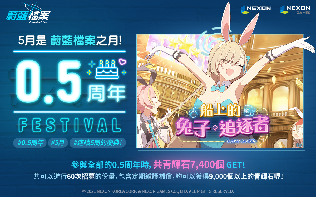 NEXON 旗下手機遊戲《蔚藍檔案》宣布更新遊戲全新活動劇情「船上的兔子追逐者」以及推出全新角色「寧瑠(兔女郎)」、「花凛(兔女郎) 」,另外配合五月《蔚藍檔案》之月,官方也同步公開 0.5 周年慶典活動,更多詳細改版資訊請看以下內容。