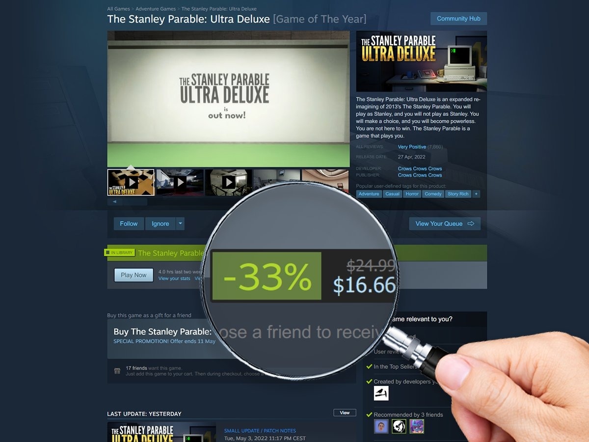 《史丹利的寓言:終極豪華版》 現正於 PC(Steam)/Xbox Series X|S/Xbox One/PS4/PS5/Nintendo Switch 等平台上推出,如果有在 Steam 購買原版《史丹利的寓言》的玩家,可以在 5 月 12 日前享受六七折的優惠價格。